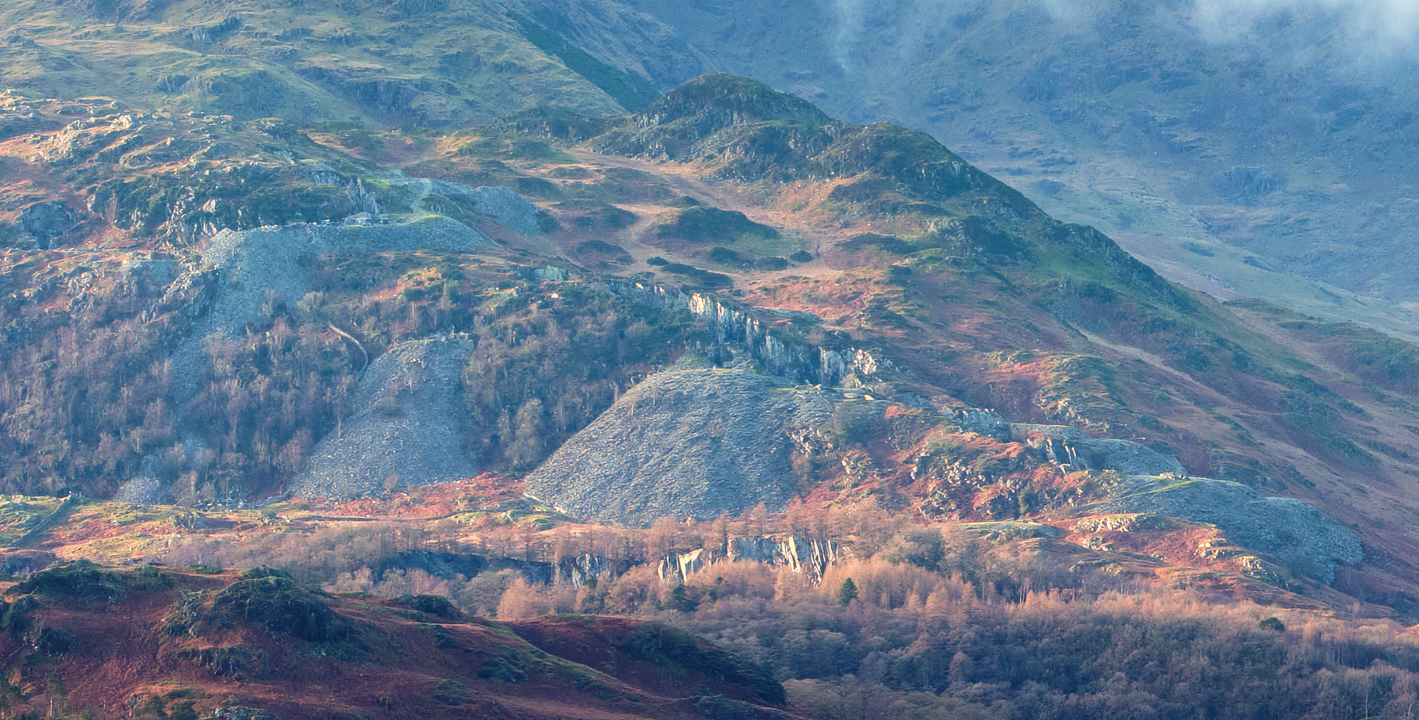 Bit of a bonus pic. This is a crop from the previous image that's been through a Topaz sharpen and upscale step to show the details of Runestone quarry, a long gash cut into the lower flanks of Wetherlam. When we visited the quarry at the beginning of the year and stood at the top of the cutting, I had no appreciation of just how large these working were or for that matter the size of the spoil heaps on the side of the mountain.