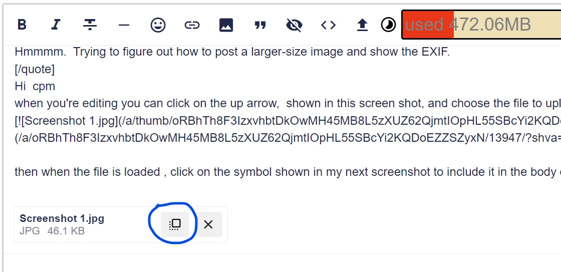 then when the file is loaded , click on the symbol shown in my next screenshot to include it in the body of your reply