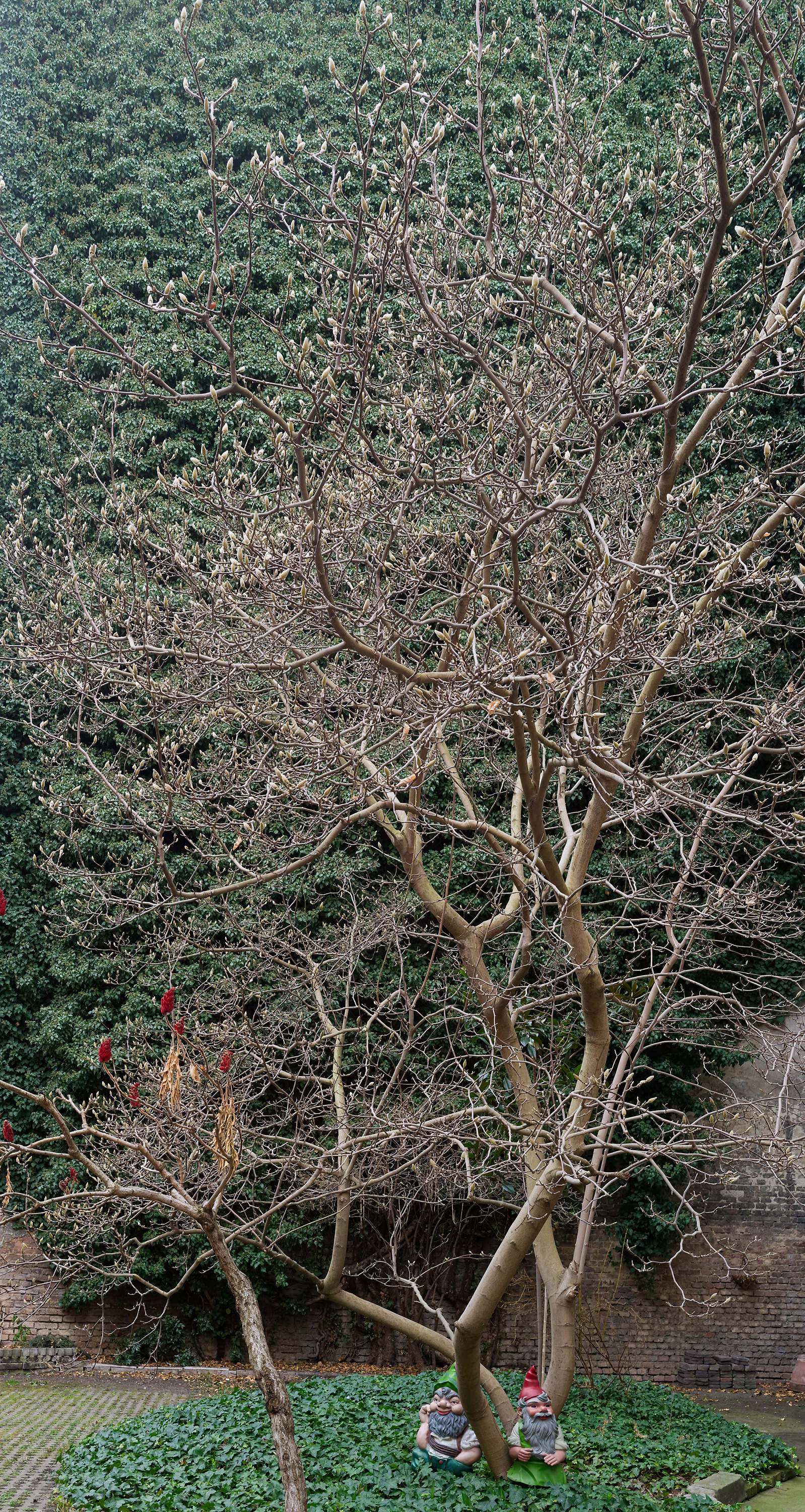 The magnolia tree is in bud, but will not produce blooms until the ambient temperature rises.