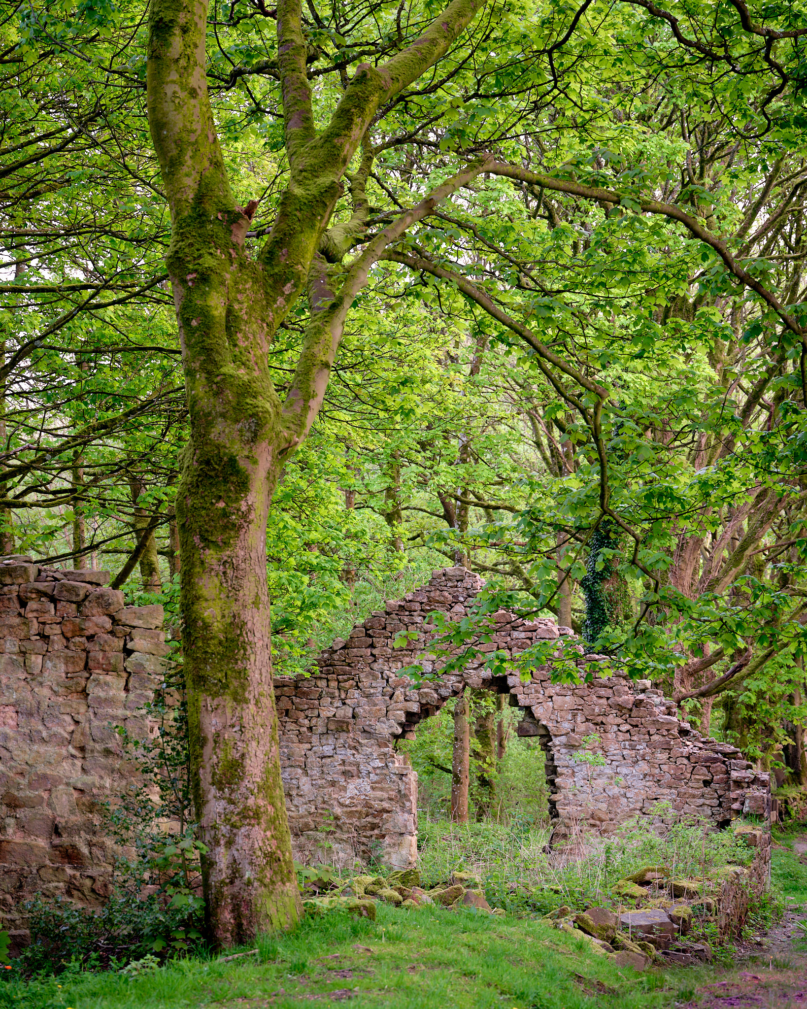 A more substantial ruin stands on the opposite side of the track to the murder house. This was taken from inside the ruin. I like the way the ivy is gradually consuming the interior (I say interior, but it's really just a single wall with a pile of rubble behind it, I was stood on said pile of rubble here). Unfortunately I couldn't find anything particularly interesting to line up through the window. I would have been tempted to go a bit wider here too, but the interior was swarming with midges so I didn't fancy changing lenses in there, not to mention I was quite eager to get out of there.