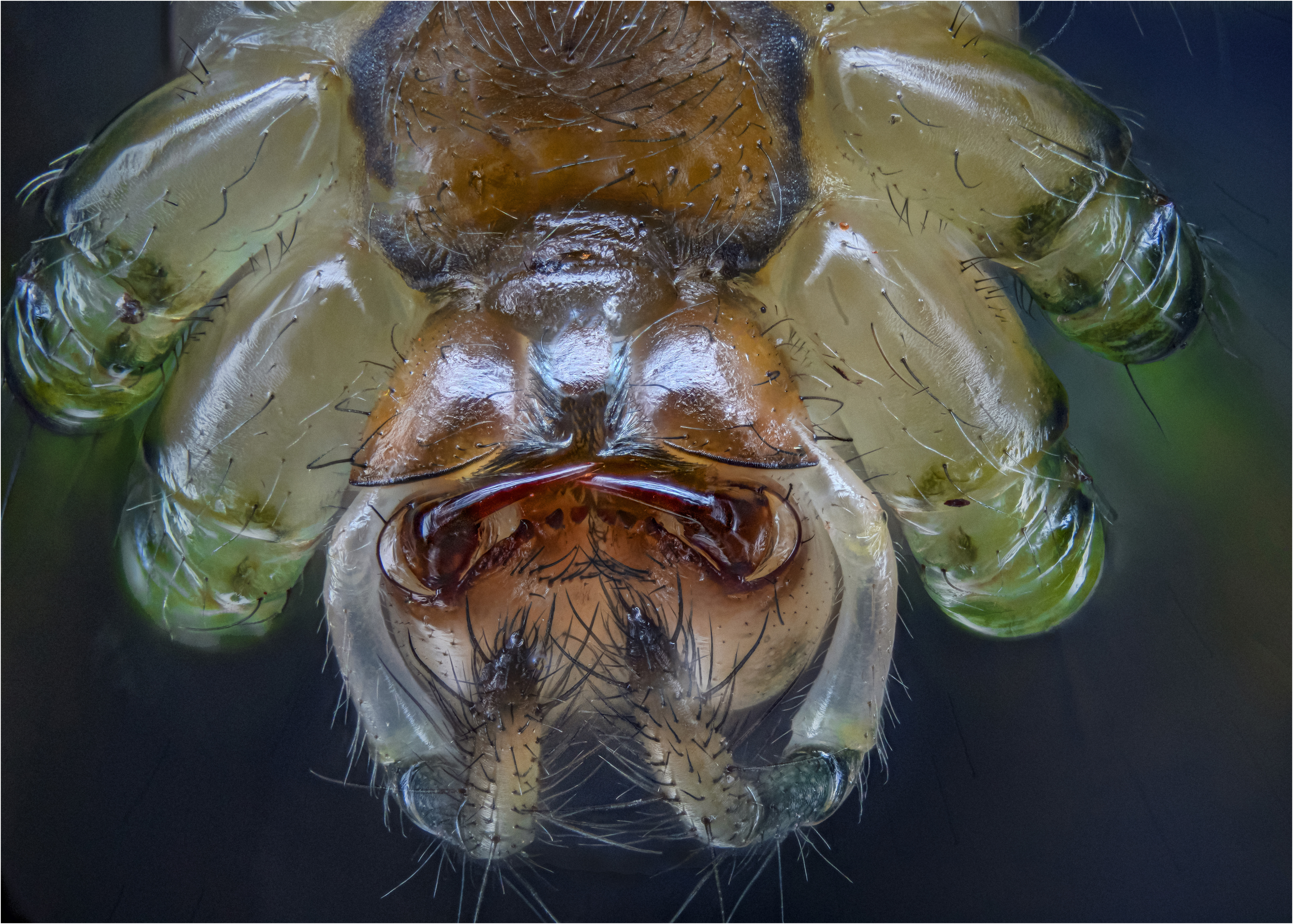 This was tuff, there is no way you would shoot this shot with an electronic device, the spider was swiging by 2 strands and only the constant turn of the dial and continuous shooting made it a reasonable sucess, its not perfect shooting 400 images stacks with a spider swinging in the air, i could rock my whole studio by moving my chair. i have no vibrations but can rock it ever so slightly as my studio is 2 floors up and sitting on 6 350mm dia telegraph poles 😁