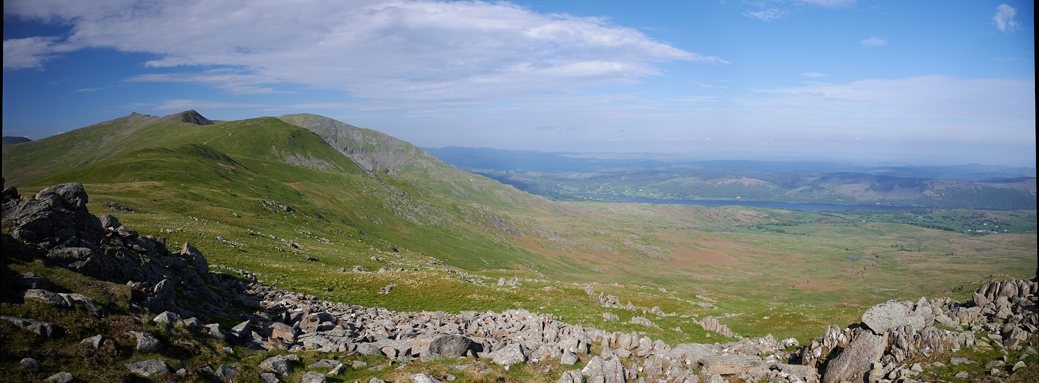 This is a stitched pano stretching from Coniston Old Man and its many surrogate fells on the left across the visible length of Coniston Water.