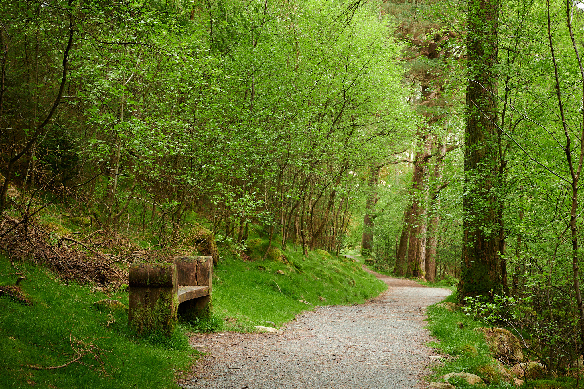 We followed the path around the tarn and through the woods. Here and there were dotted wooden benches such as this one.