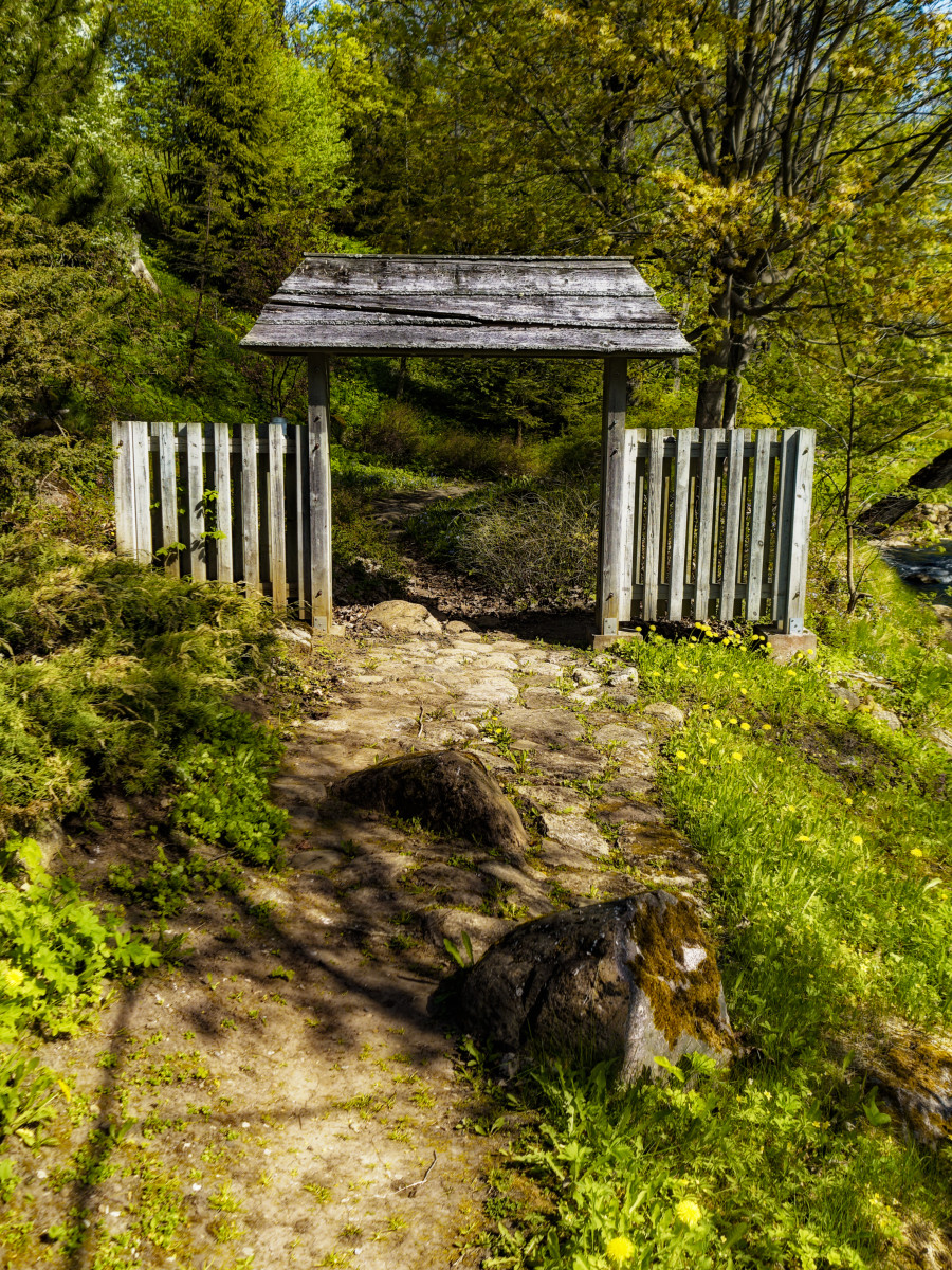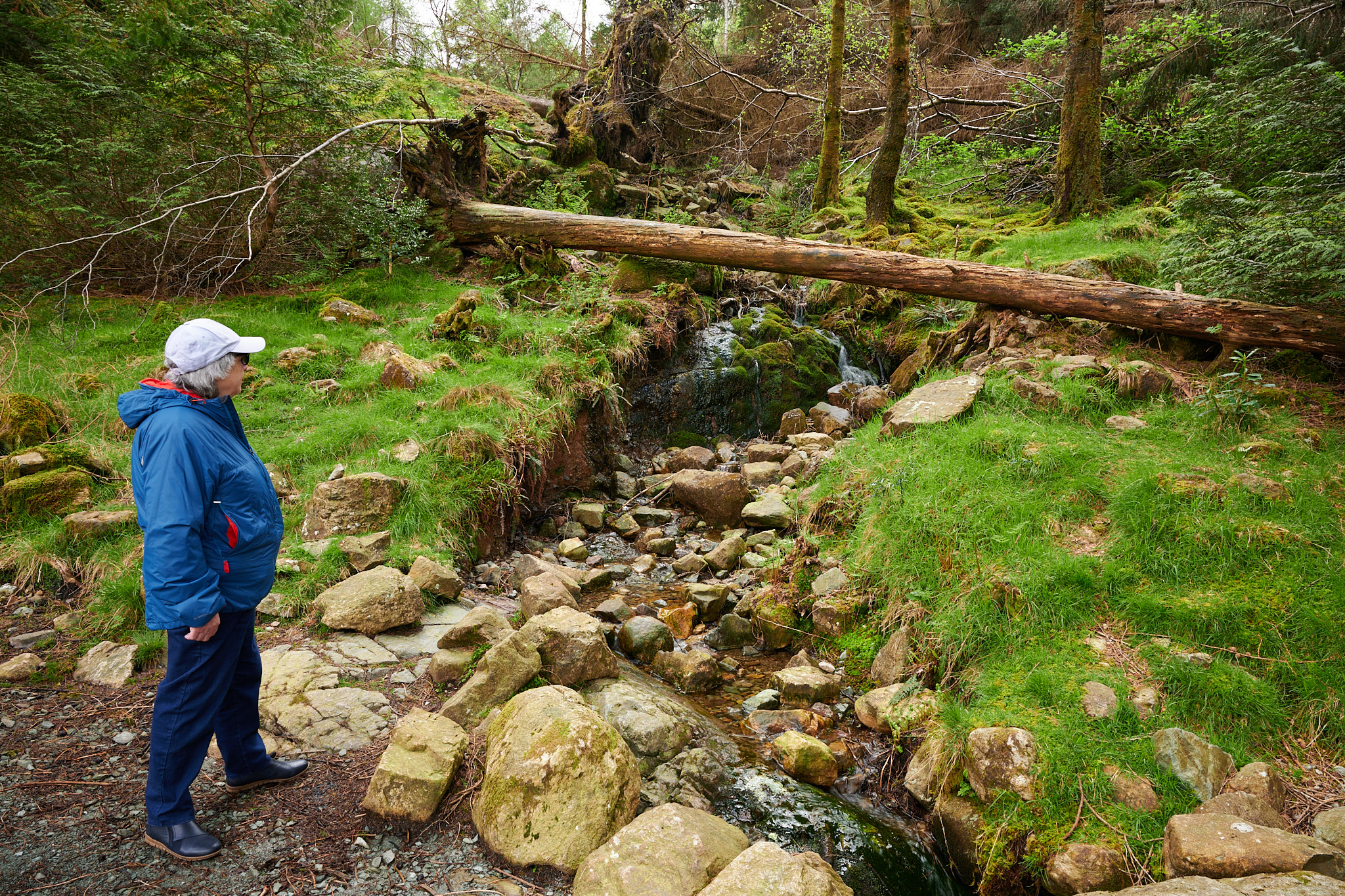 My mum admires a little brook that emerges from the woods, only to disappear into a drain beneath the path.