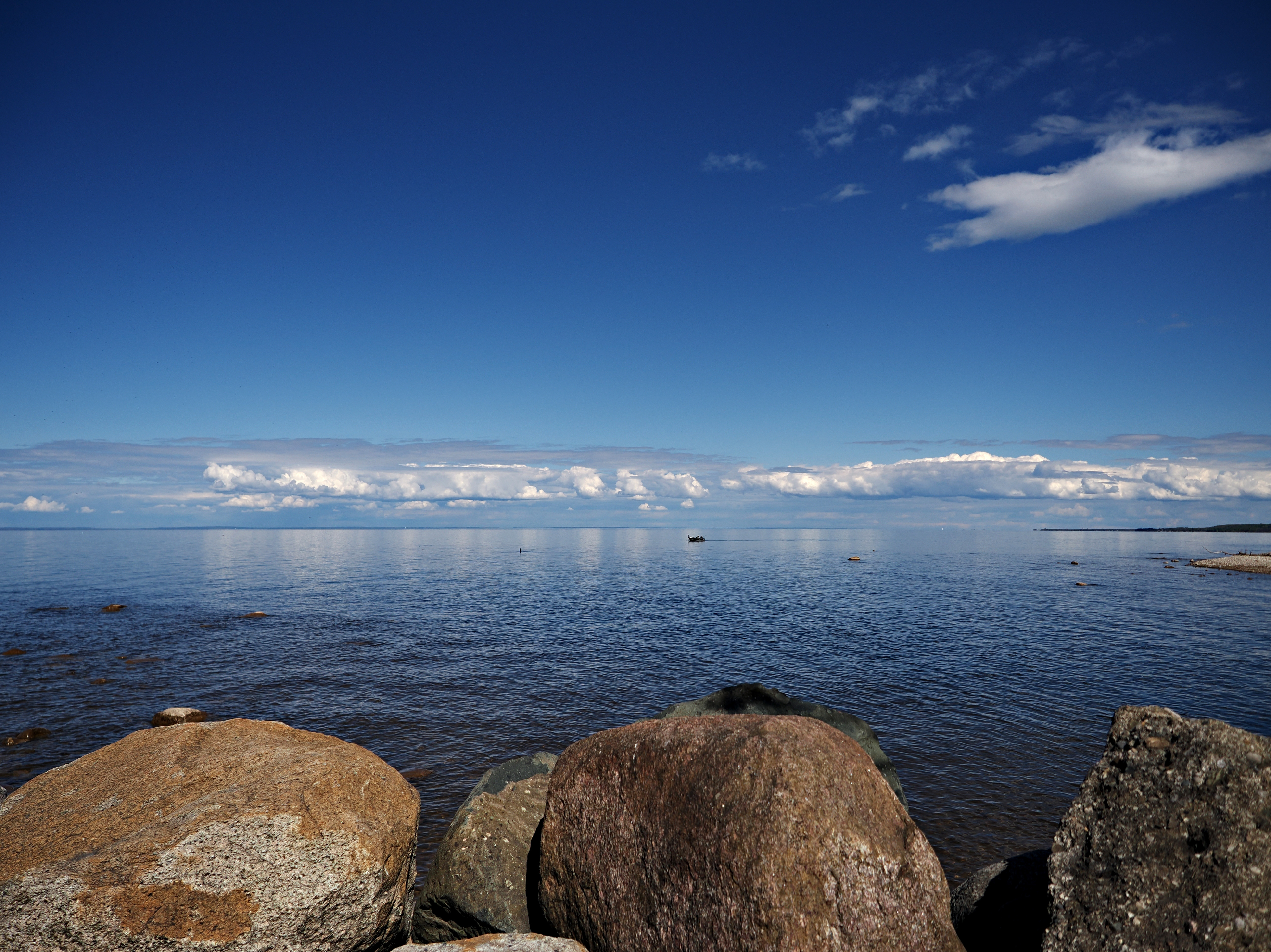 The clear cloudless sky imo helps on this occasion. Had the sky been more "dramatic" with clouds they probably would have been an eye-magnet drawing the eyes away from the lone fisherman on the rocks.
