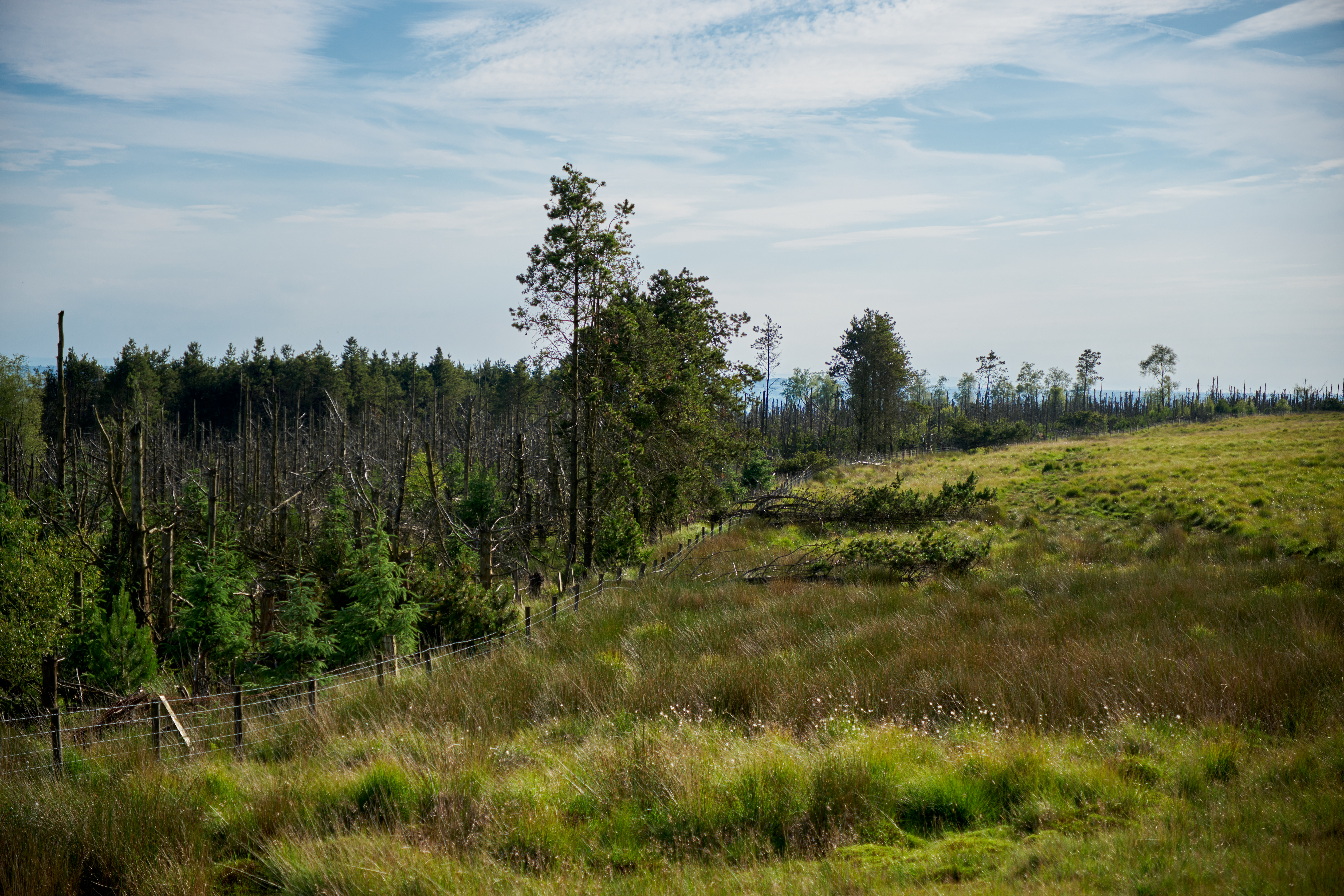 My route took me along the North edge of Holt's Flat, a nearby plantation that seems to be doing a lot better than its neighbour. Unfortunately, it shortly after passing Holt's Flat that my route went awry, taking me through a meadow of high grass, which concealed all kinds of (literal) pitfalls including potholes, divuts, bogs and marshes. Nice. Slowly and carefully I made it through to the gravel path that leads up to Standing Stones Hill. I had planned a more direct assault, but would probably be dead in a ditch now if I'd carried on in that direction.