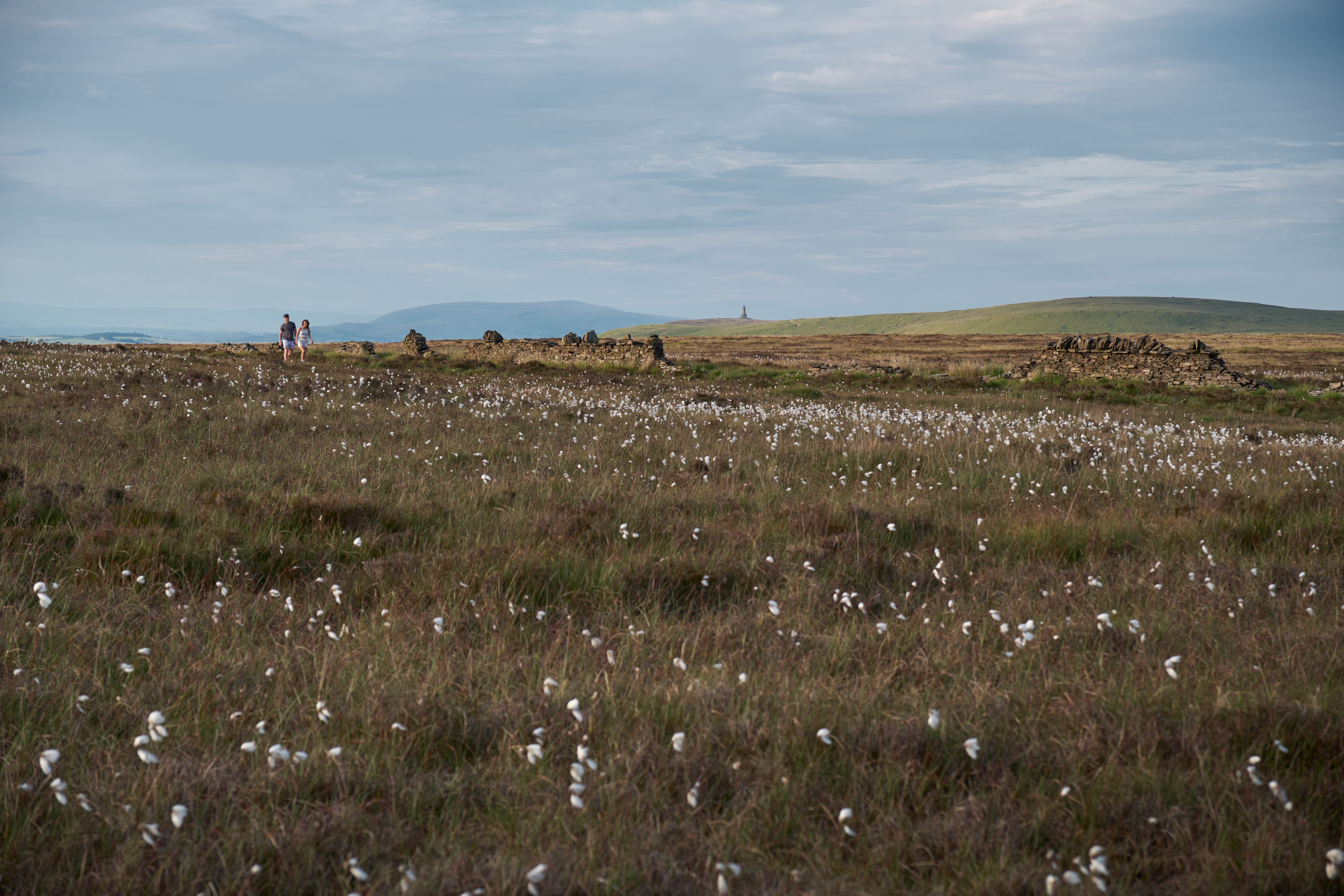 The highest point above Standing Stones Hill is known as Redmond's Edge and is home to the closest we'll see to and standing stones in the form of this gradually disappearing dry stone wall. Surprisingly there were actually other people up here. In the far distance, you can see Pendle Hill, probably swarming with amateur witches on a significant night like this and just in front of it stands Darwen Moor, with Jubilee Tower on the top.