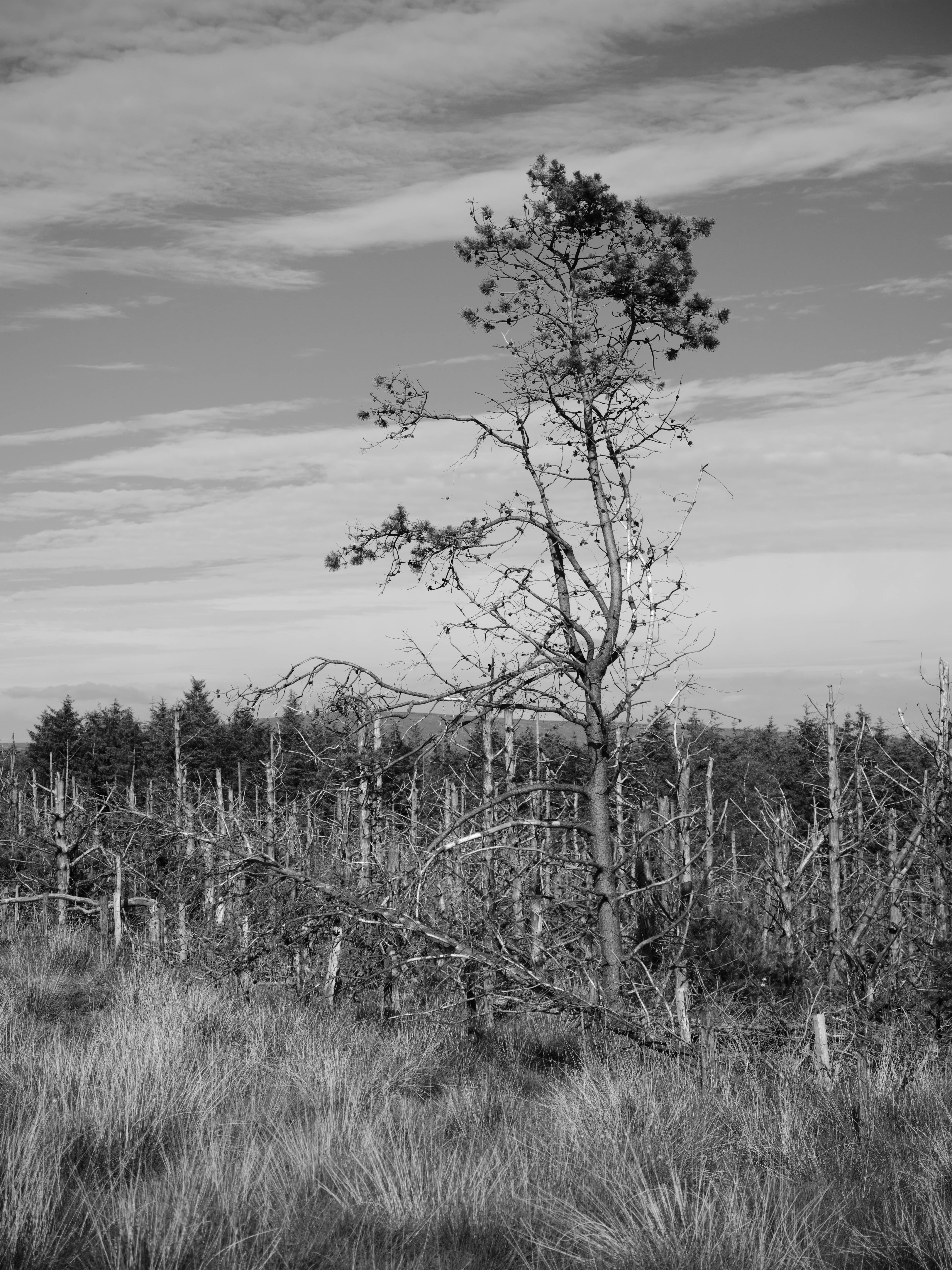 The plantation known as The Flat runs along one edge of the Pikestones site and was unfortunately burned down in part some years ago (or "brunt" as they used to say in these parts). Here's a plucky tree making a failed bid to escape the ravaging flames.