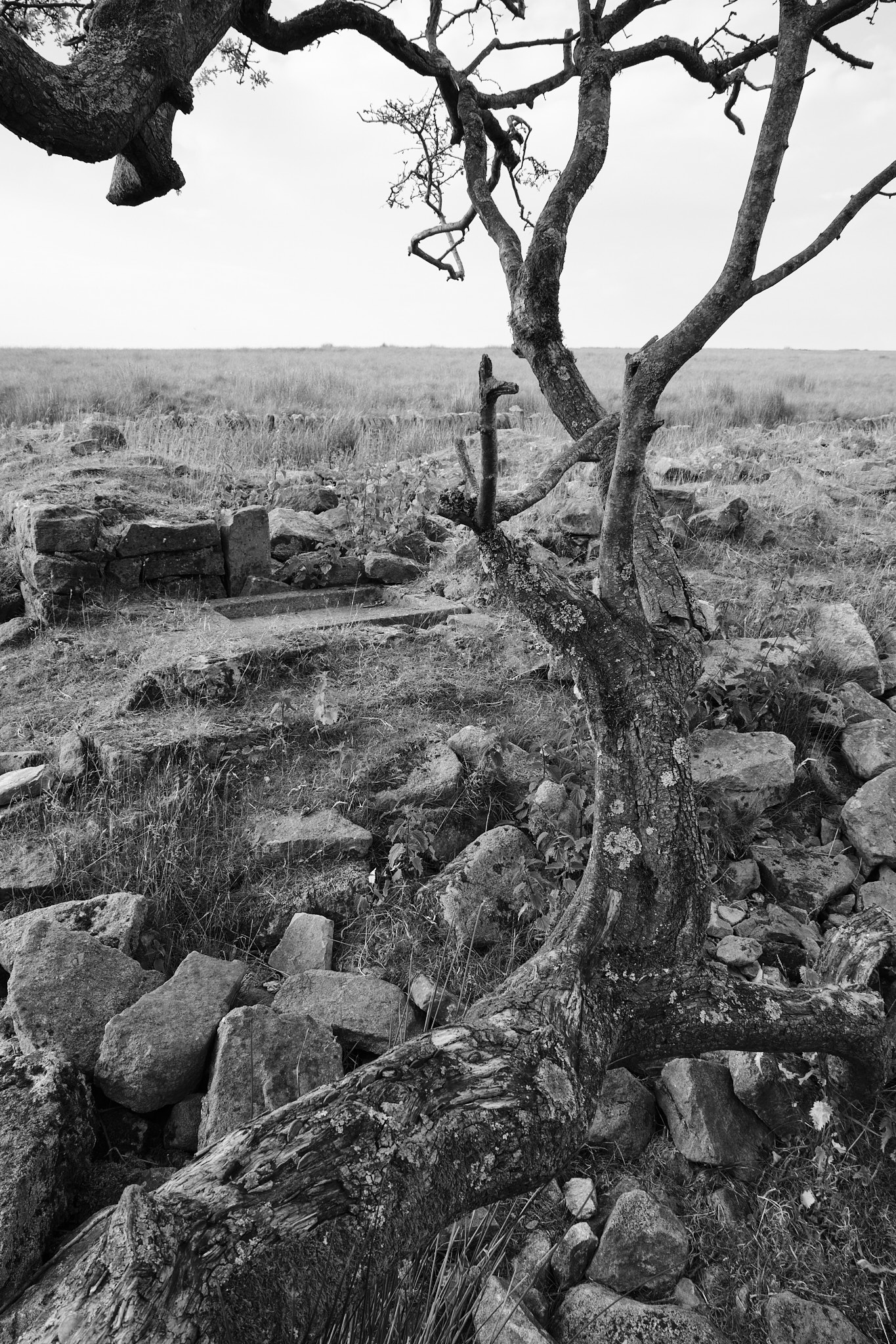 Here's a view of the slop stone from the other side, showing its location in relation to the wiry Hawthorn tree that dominates this ruin and almost seems to be looming above it from this perspective.