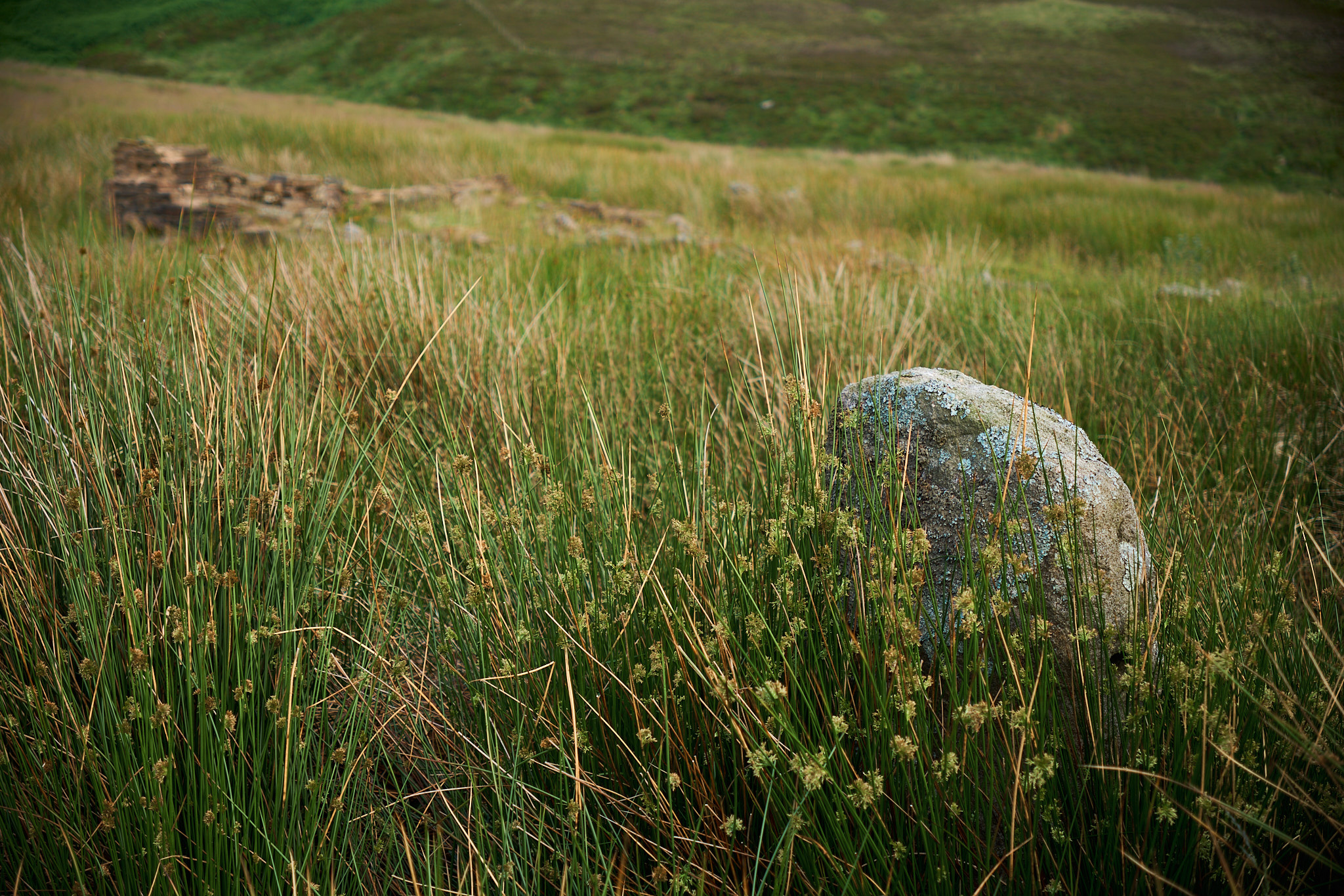 Further along the path across Heapey Moor we come across the oft ignored ruin of Grime's farm. Between the path and the ruin, almost lost in the grass stands this lone gatepost, which, without its companion almost looks like some forlorn and lonely standing stone. Barely poking out of the grass, it always reminds me of the shy and nervous standing stone in one of Terry Pratchett's Discworld books, that just wants to be left alone and will resort to hiding in a bog to avoid receiving any attention.
