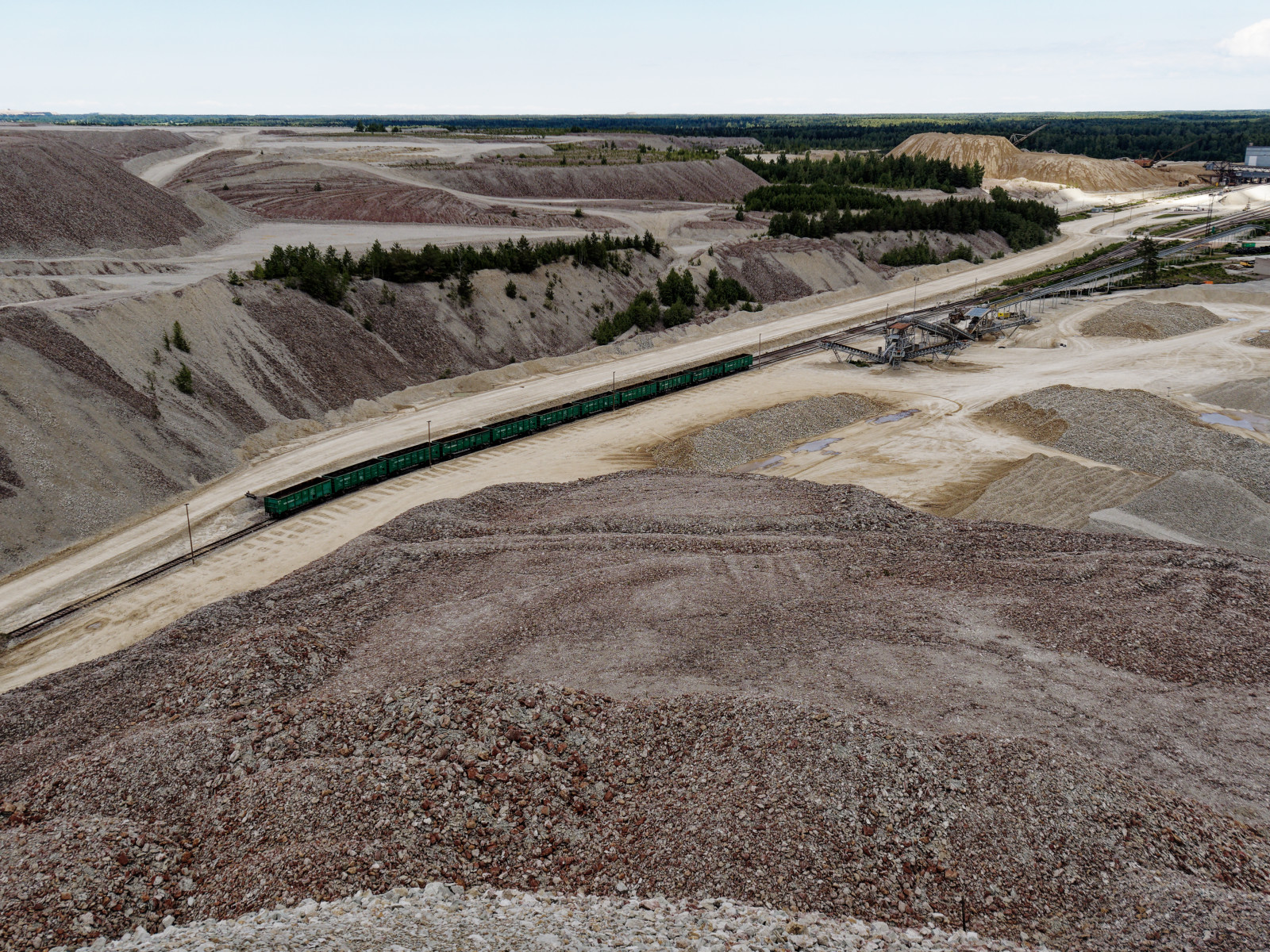 View to mining area. On right edge of horizon one can see tall stacks of power plant, using that mined oil shale. That power plant is near to river Narva, separating Estonia and Russia.