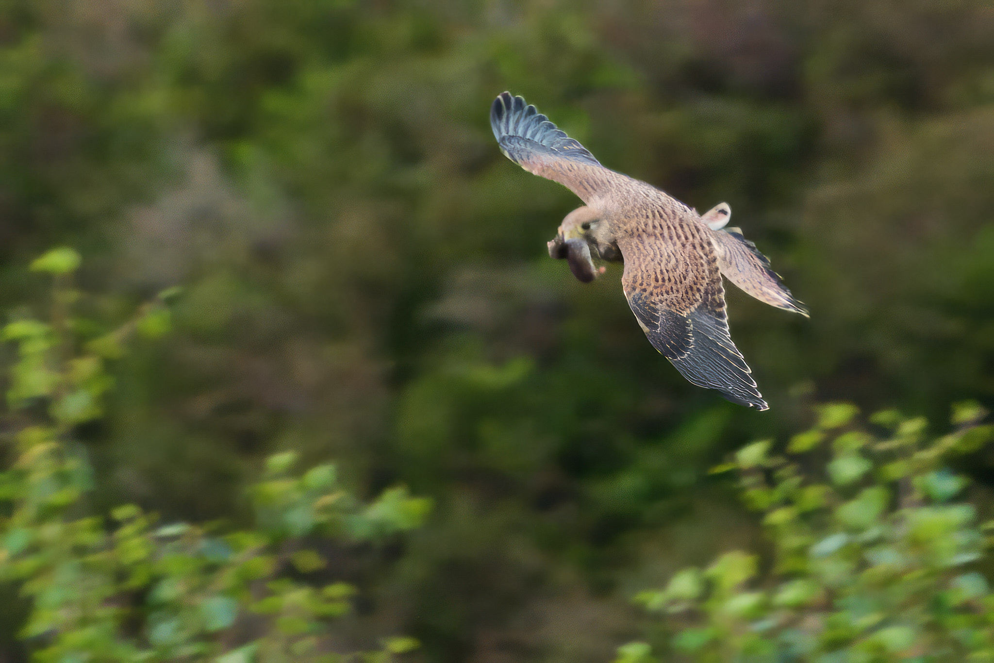This was an early attempt to catch one in flight. At the time I took this, I hadn't realised she was carrying a tasty snack in the form of an unfortunate field mouse (or it might be a mole, I'm not entirely sure). This was a relatively small crop, so it's had the full gamut of what Topaz can throw at it (upscale, noise reduction and sharpening) to try and make something acceptable.