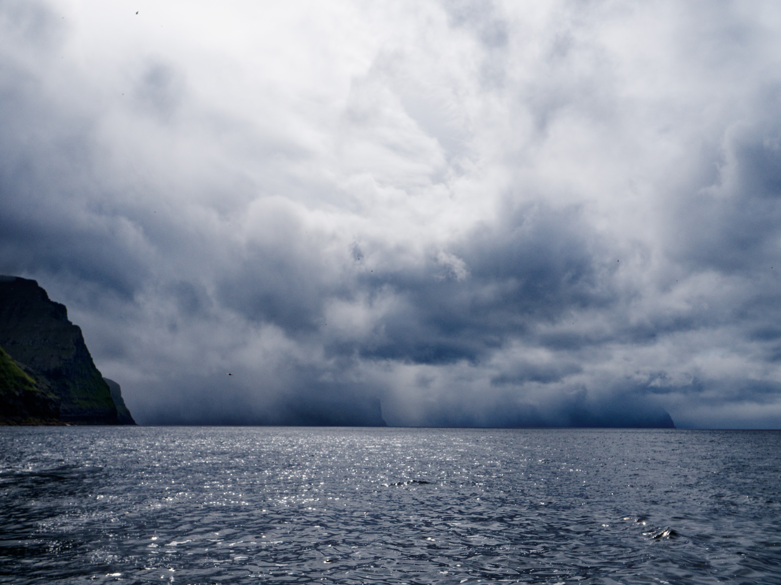 Looks almost like a wall of clouds coming straight at us. the sparkle on the water's surface is really nice