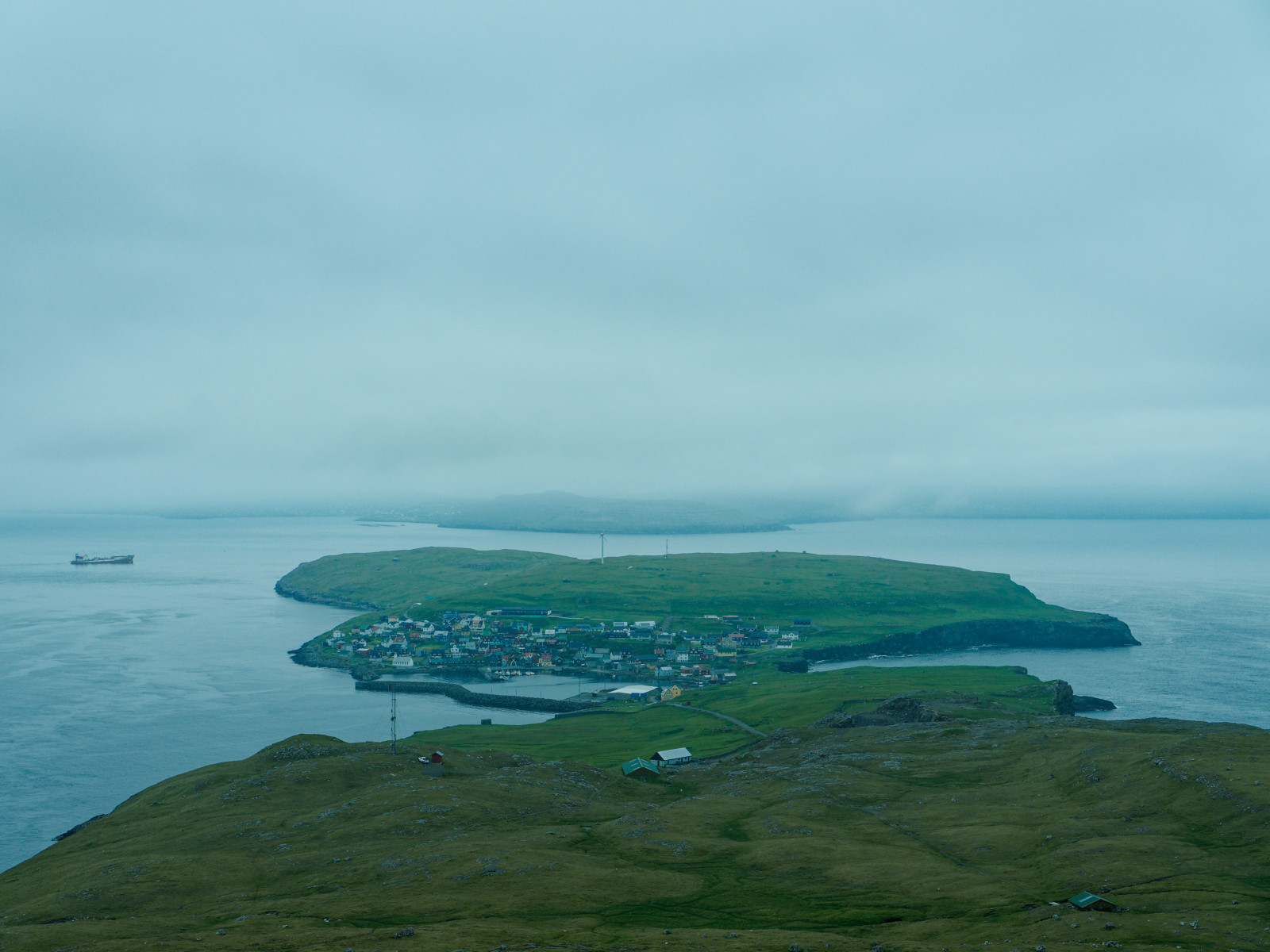 Look to island from Tórshavn fortress. Village and harbor can be seen where profile is lowest.