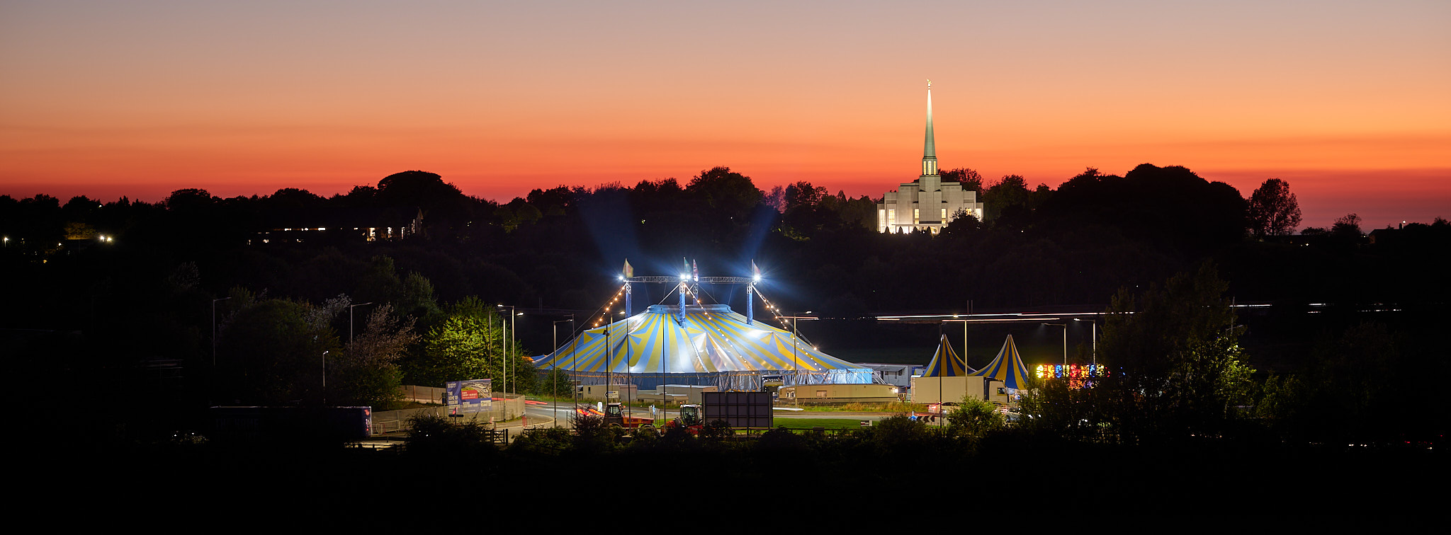 As I drove home I spotted this scene and had to take a shot. Regular travellers on the M61 will recognise the Preston Mormon Temple in the background, a clear indication that you're in Chorley and not Preston as the name might imply and in the foreground, a travelling circus had just set up. The sunset had been quite spectacular in its colour, if a bit lacking in interesting sky detail, but I'd just missed the best of it by a few minutes when I took this.
