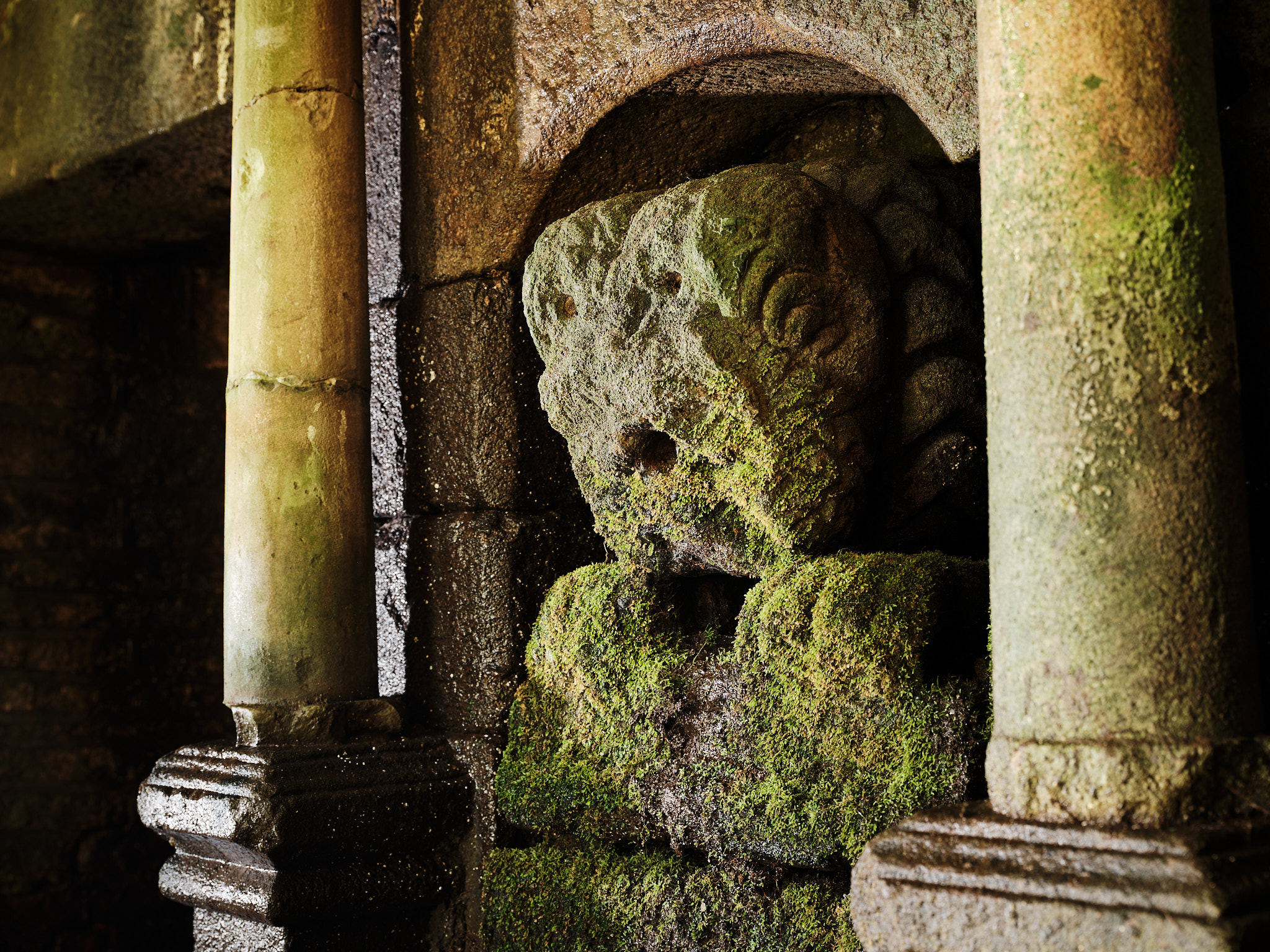 The carved lion's head has seen better days and is missing most of its features in 2024. It's difficult to determine where the water is coming from inside the building, but originally, it would have spewed from the mouth of the lion into the pool beneath it. There are also slots in the stone above each of the side tanks where water appears to drip in. It's difficult to imagine this ever being free flowing, but maybe it's just silted up due to a lack of maintenance?