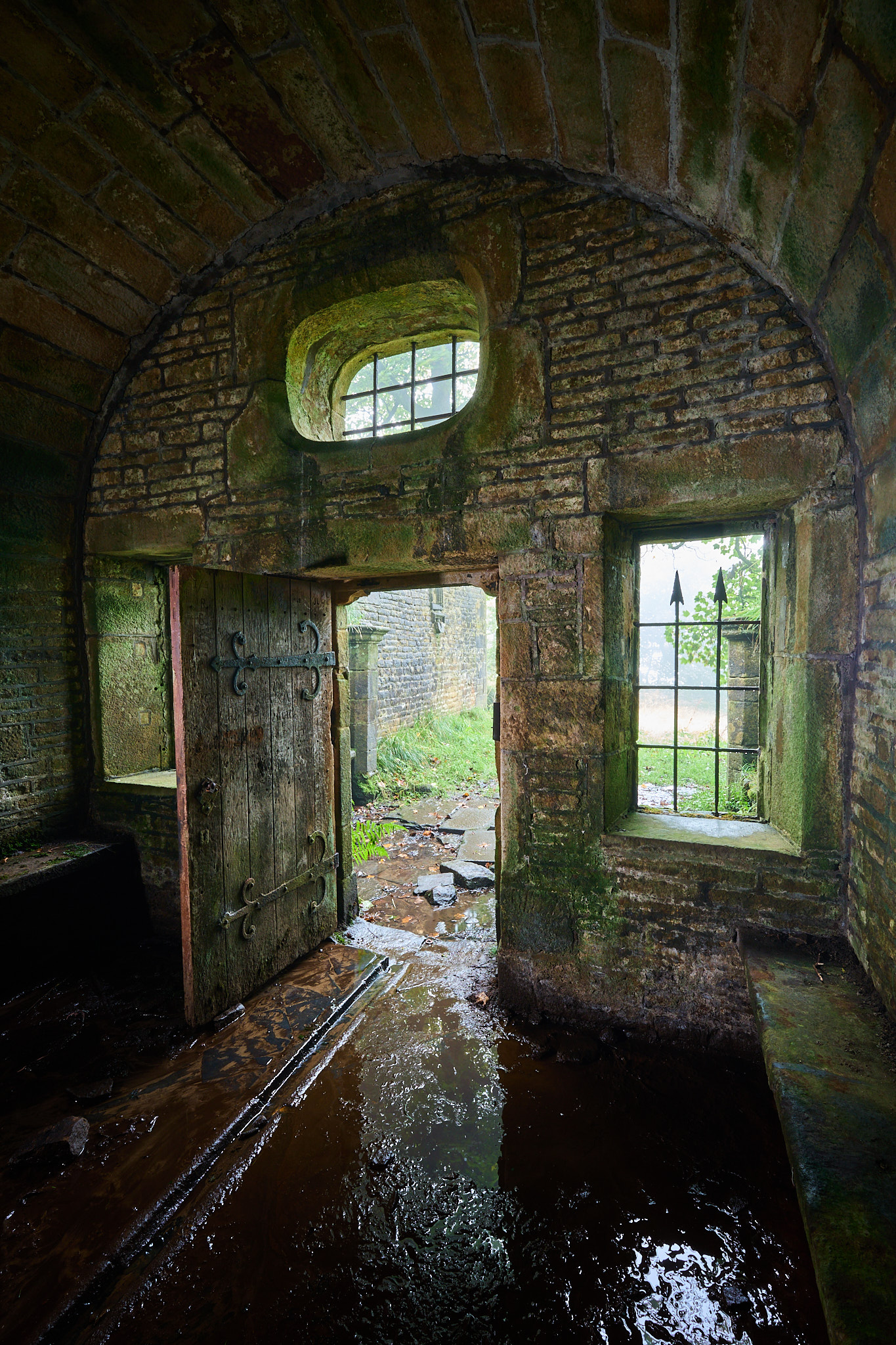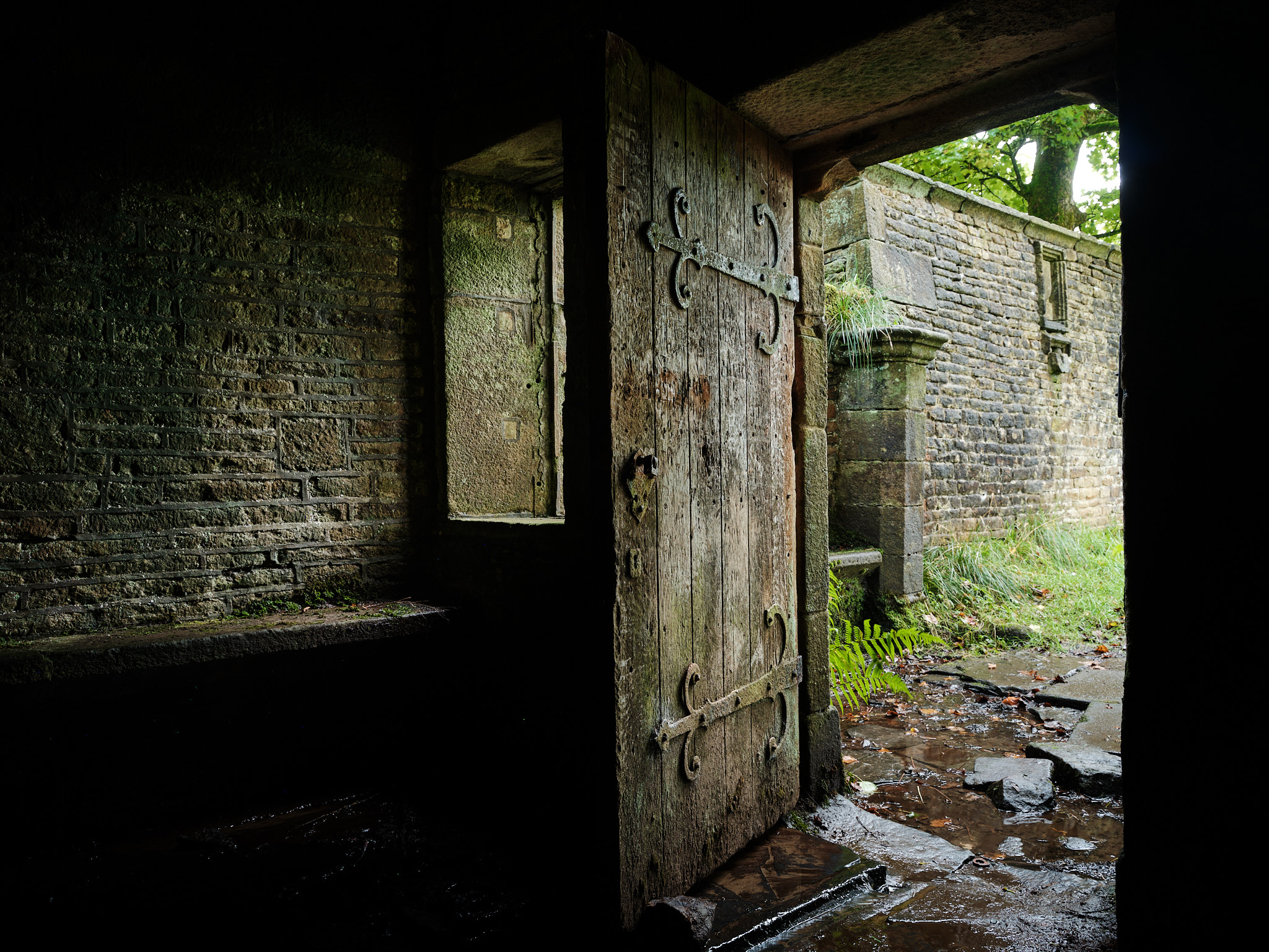 At the front of the well house there's a small forecourt. The overflow drain from the well runs along a channel beneath the door and out into this area, but where the water is supposed to go after that is anyone's guess. On each day I was there, this was running continuously. Isn't that open door inviting? Well, no, not really, but we're going in regardless.