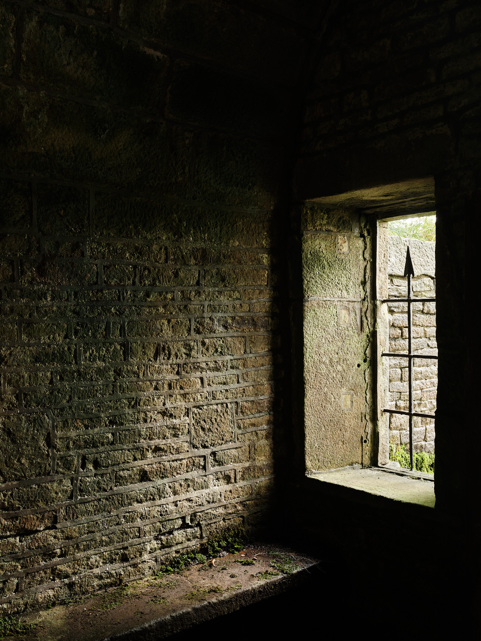 When I visited the previous day with just a phone, there was direct sunlight outside this window and the bars were casting nice, sharp shadows on the interior walls. With this being such an overcast day, there were no details in the shadows, just a bit of diffuse light attempting to disperse the gloom of the interior and doing a poor job at that.