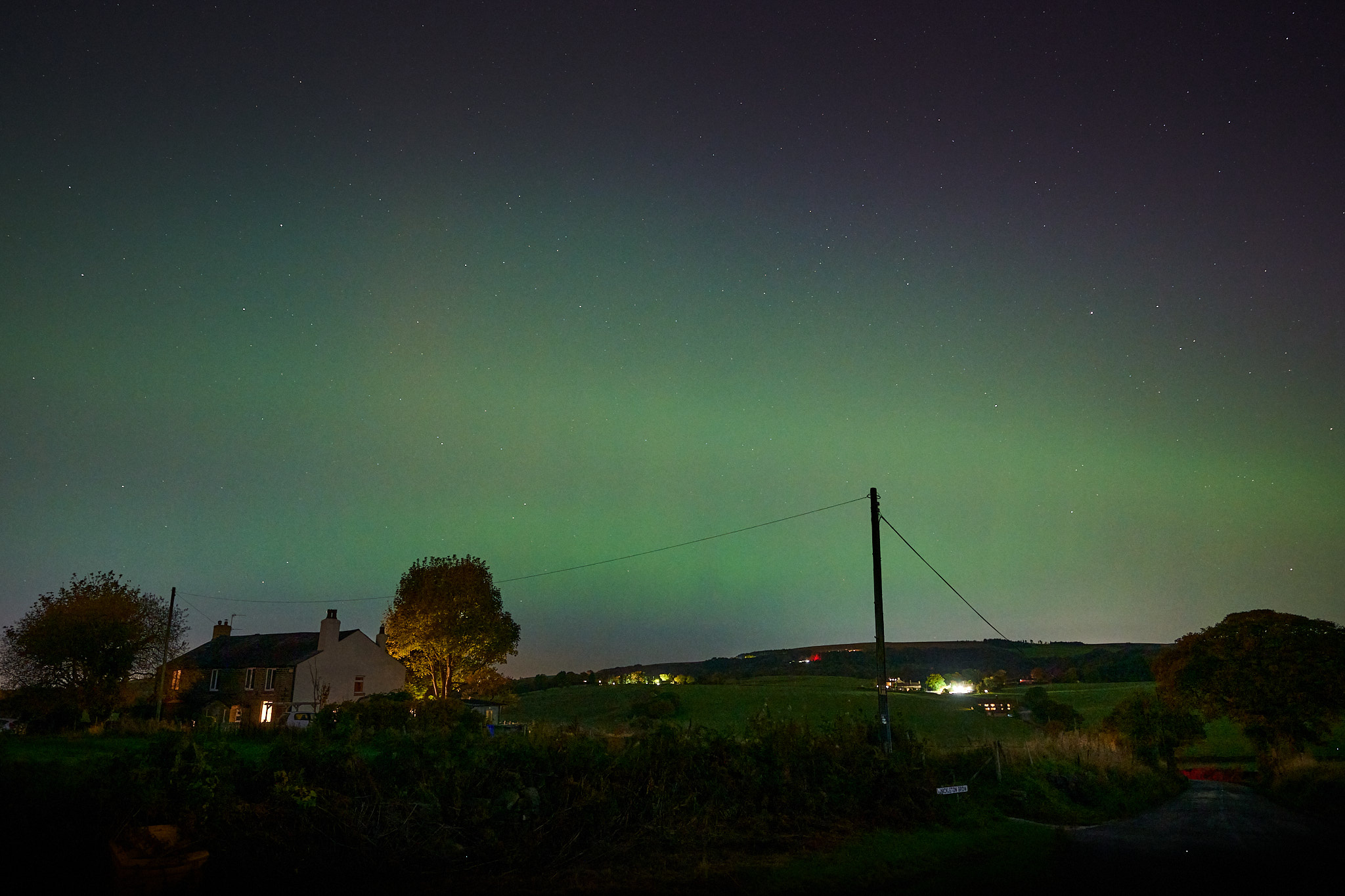 After hanging around at the reservoir for a while, we headed back towards Chorley via Nickleton Brow, where I stopped to take this shot. Still no significant structure in the aurora or variety of colour.