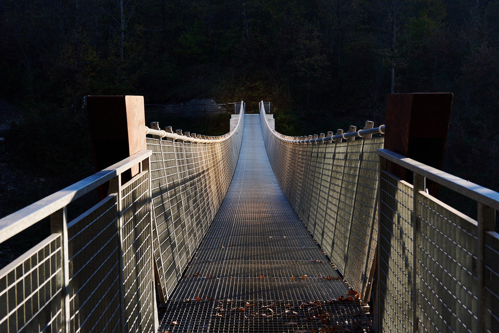 The cable bridge needed to be rebuilt after the torrent swollen by heavy rain tore the old one down. The sensibly built it much higher this time.