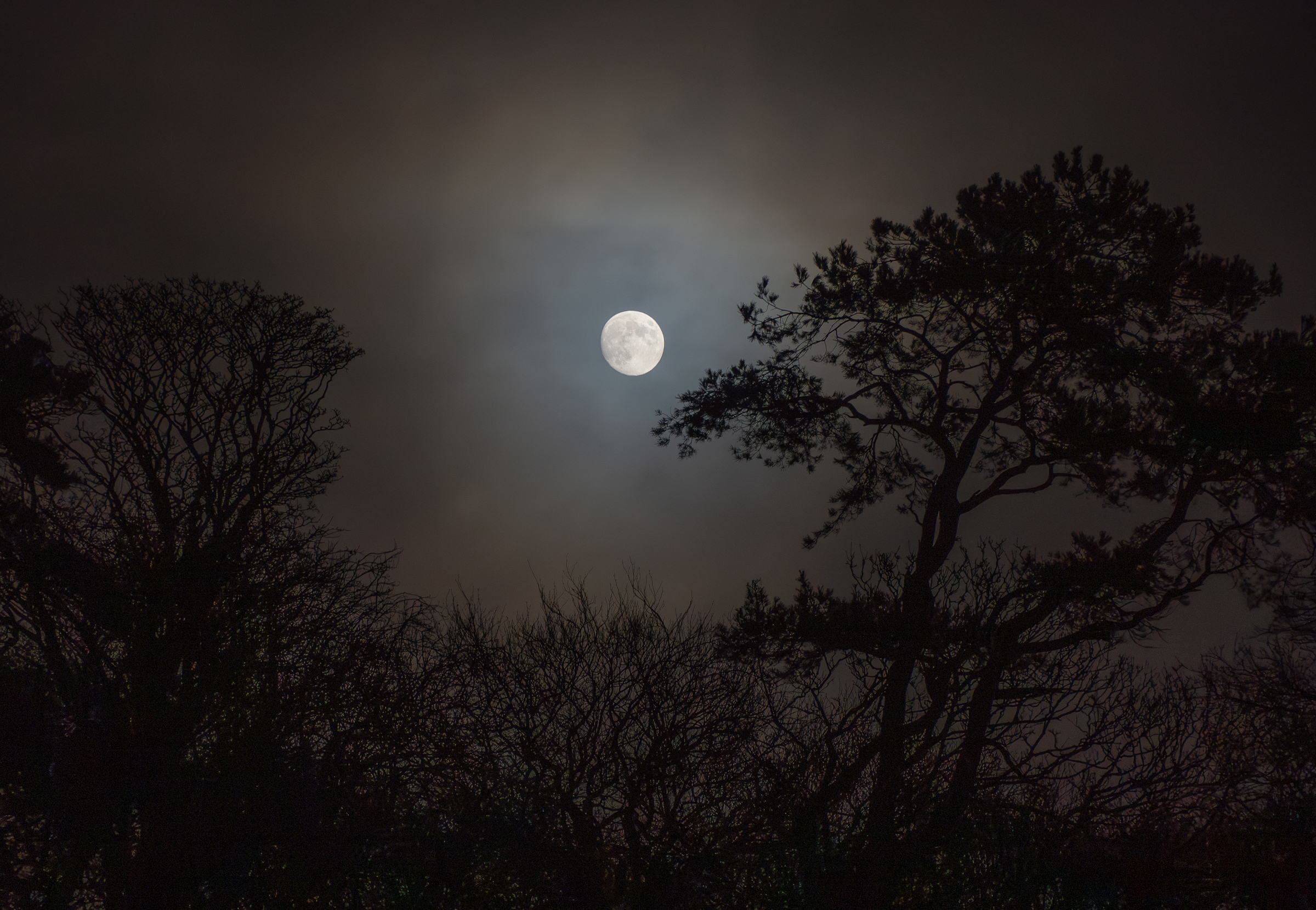 Last night this scene caught my eye from the kitchen window as I started cooking dinner, so out into the garden... There are some characterful Scots pines on the field boundary beyond. The moon appeared just briefly through the fog, which resulted in interesting halo effects.