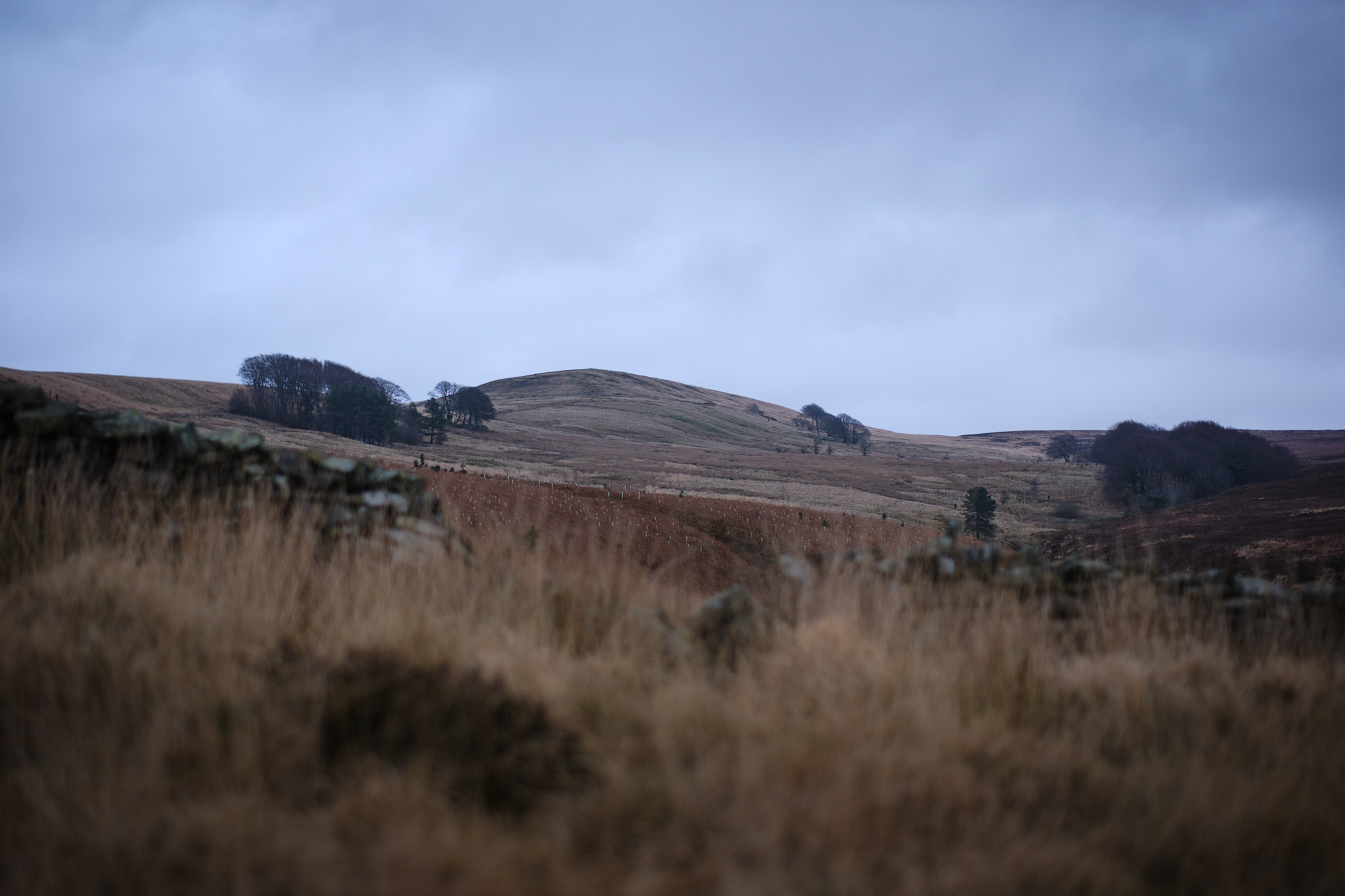 Along the way there are various gaps in the wall where lack of maintenance has allowed the wall to tilt on the peaty surface it was built upon and slowly collapse. This was taken at one such gap just below Coppice Stile, where there's a nice view of Great Hill. The 27mm lens made Great Hill look somewhat distant and tiny against the gap in the wall, so I swapped over to the 56mm and took a few steps back to reframe it in the gap.