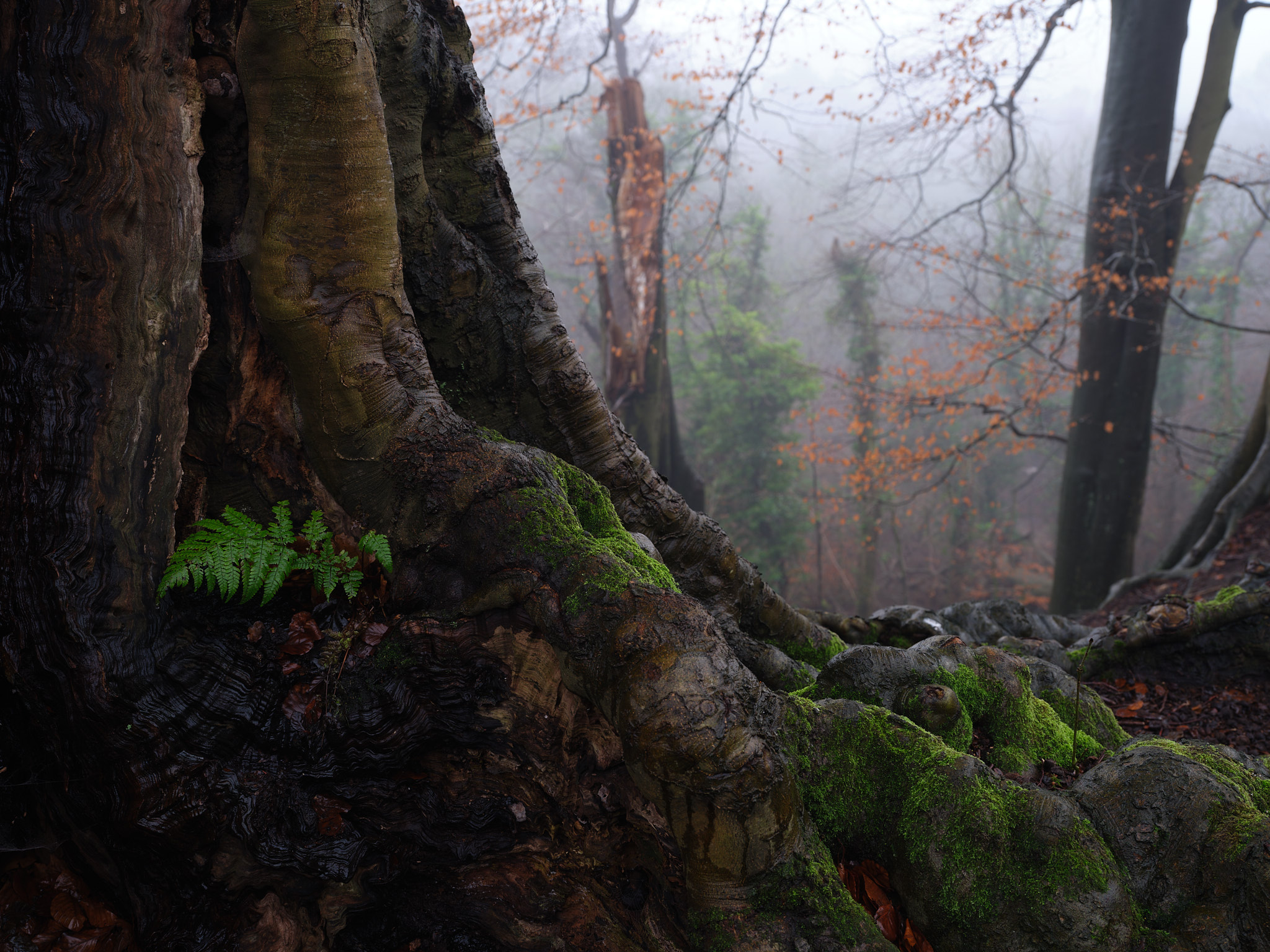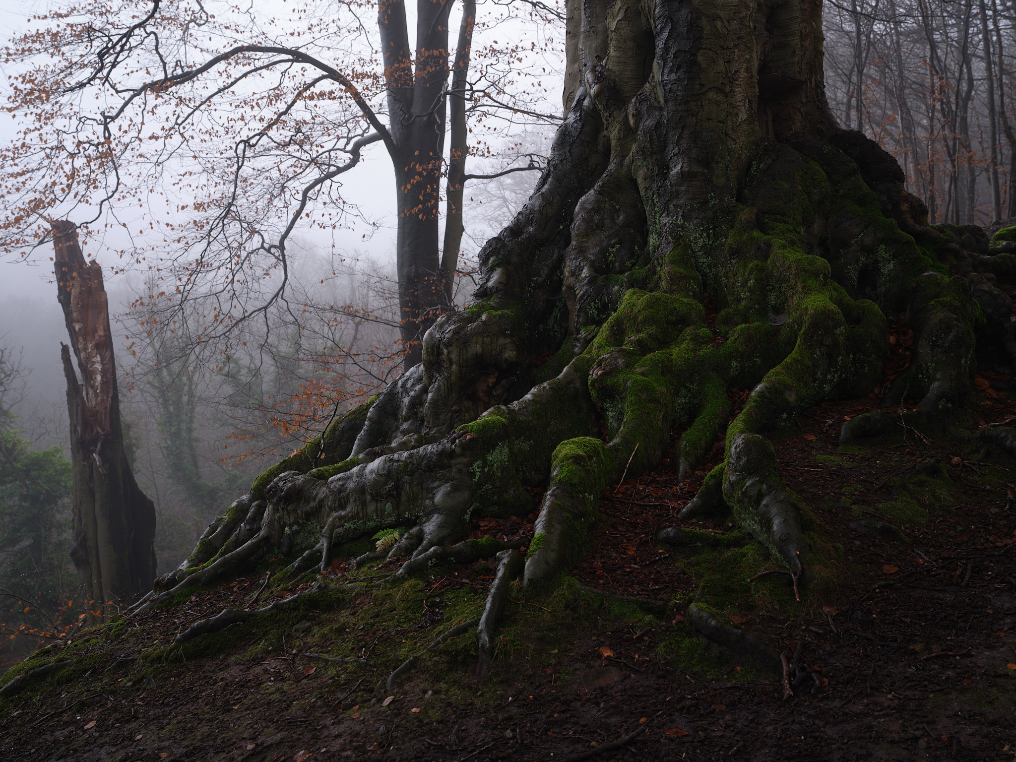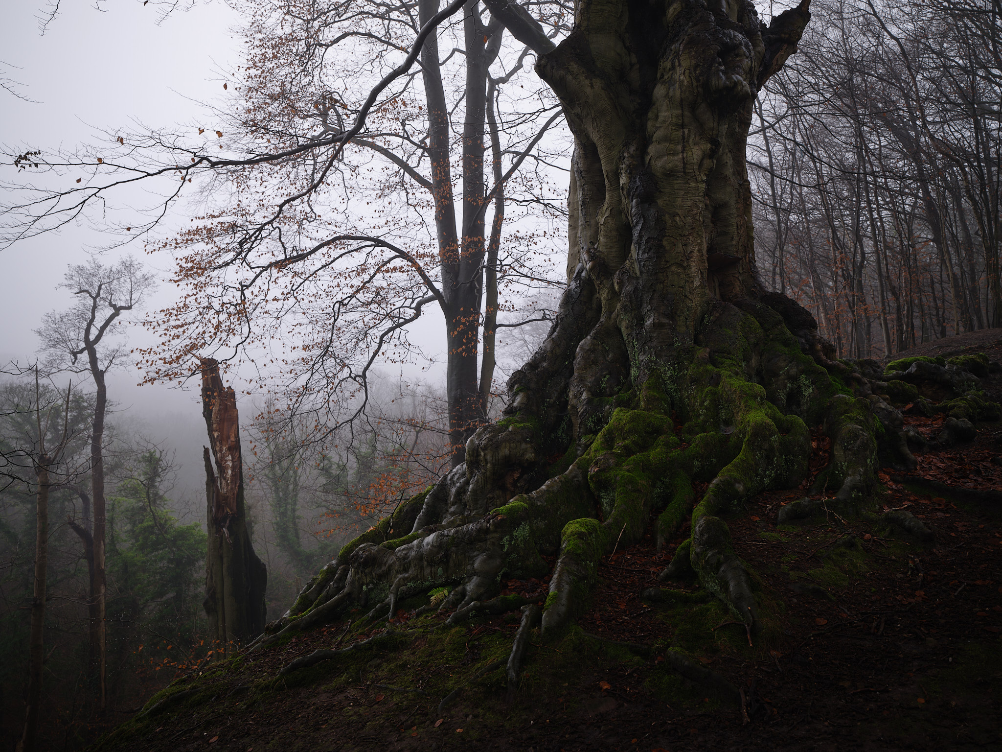 While wandering around the woods, I found an old and seemingly disused path, that lead steeply up a very muddy slope. Many years ago, wooden steps adorned this path, but they've long since rotted away, so it was a case of carefully scrambling up the slippery slope using the tripod as a walking pole. At the top, the path split in two directions, with one following the sharp edge of the steep slope that would very quickly (and painfully) lead back down into the woods if I got too close and put a foot wrong. Fortunately that didn't happen and eventually I came across this massive (for round here anyway) and spectacularly gnarly tree, perched precariously on the edge of the slope. I think it's been here for a while, probably often thinking to itself "I remember when all this were fields...". On a technical note, when taking this I had to back off the CPL a bit, so it didn't completely obliterate the specular highlights that added a bit of modelling to the right hand side of the trunk. Plenty of scope to brighten this image up, but it loses its atmosphere when I do that, so dark and sinister it remains!