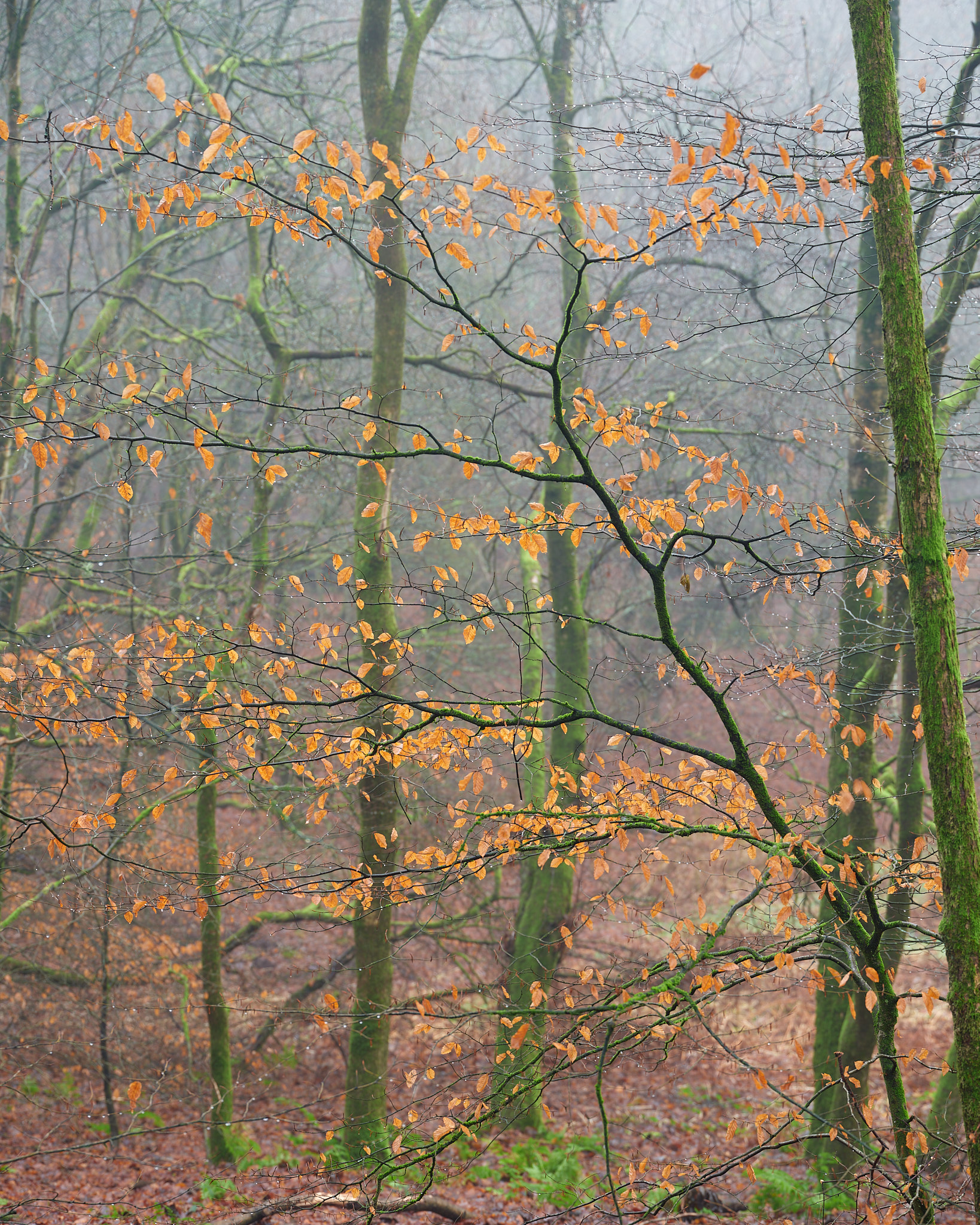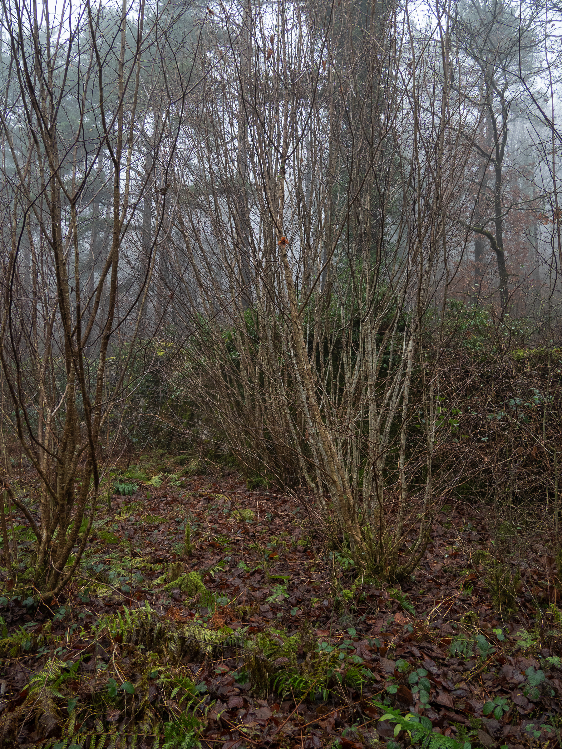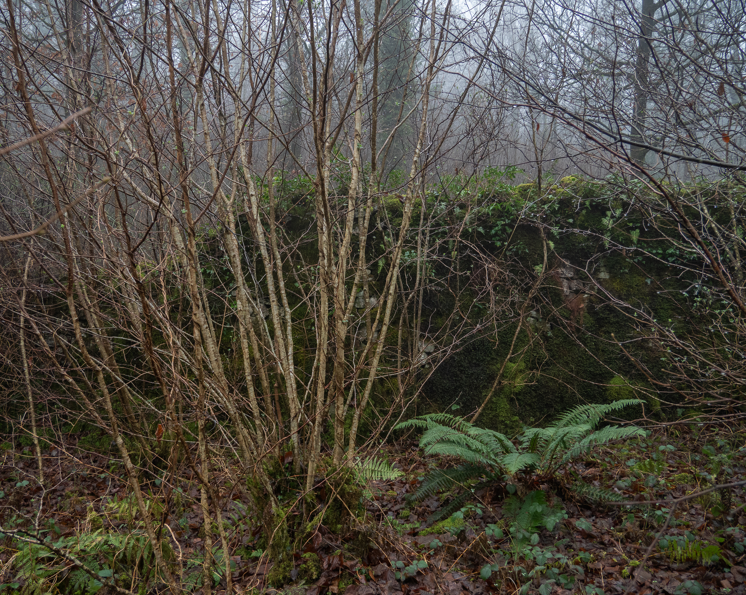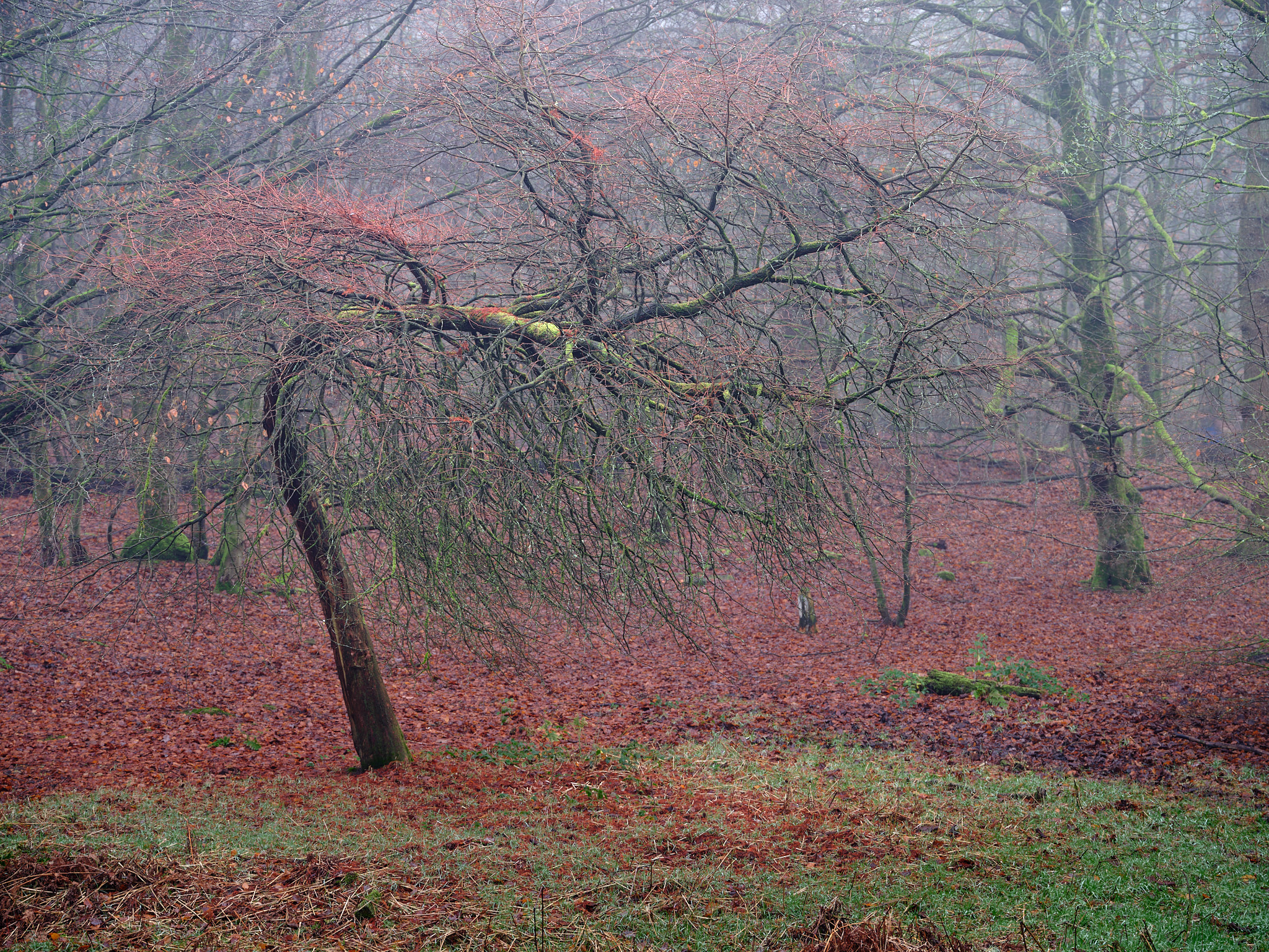 The initial composition I was going for, would have been taking a bit further forward into this image, but I couldn't get the scrubby leafless bush out of the scene and still frame the overhanging branches how I wanted them, so instead I took a few steps back and made it part of the scene. This also had the advantage of effectively lowering the central branches relative to the rising woods in background and not placing them against the sky. The disadvantage was that I was now pretty much embedded in a bush.