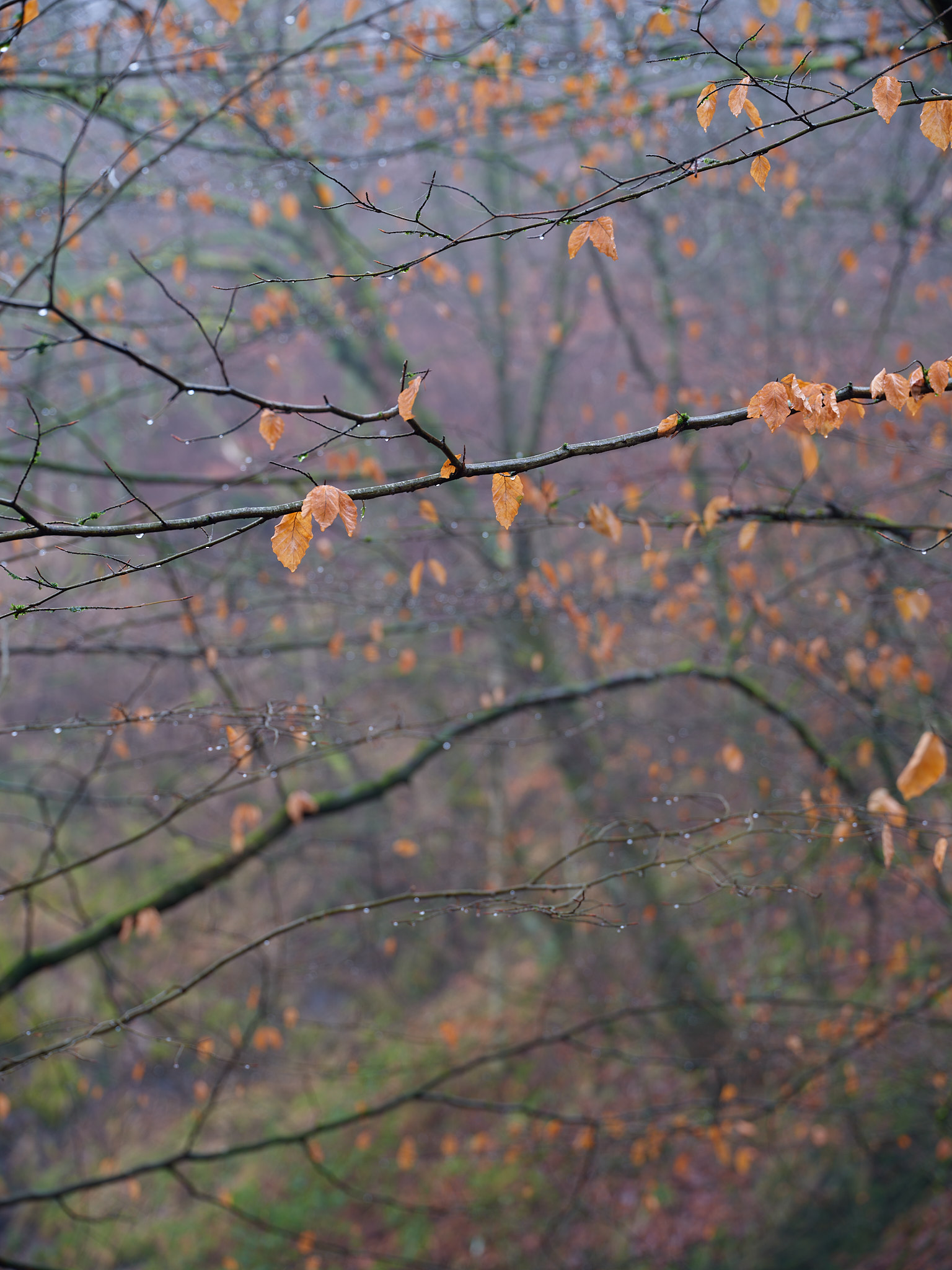 A marcescent tree I spotted on my way back down. Pity about the green trunk on the far right, but it was leaning in and too close to get rid of by moving the camera.
