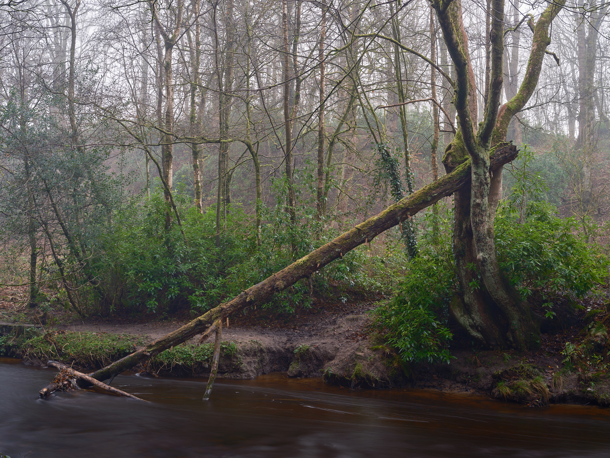I was quite surprised to see a tree that had grown like this deep in the wooded valley. Typically, I've only seen trees like this in exposed, windy locations, so it's a bit of a mystery how it got like this. None of its neighbours are bent like this.