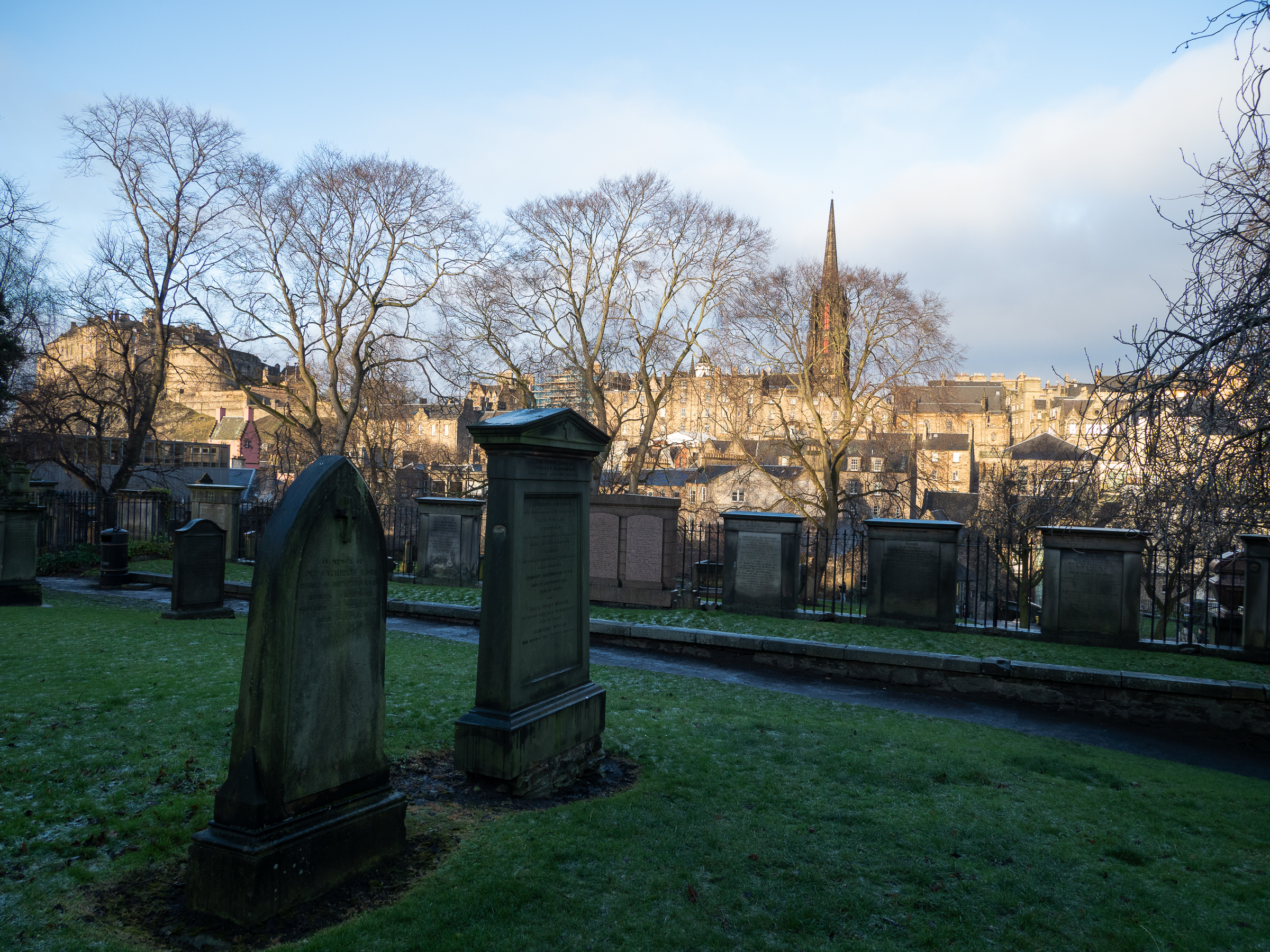 The same view next morning. The kirkyard is well known for its graves of famous scots, including John and William Adam (architects), William McGonegall (poet), William Smellie (editor of the Encyclopedia Brittanica) and mant other leading enlightenment figures. Also the famous Greyfriars Bobby dog. Sadly the grave of John Hutton, 'Father of modern Geology', was in a locked area.