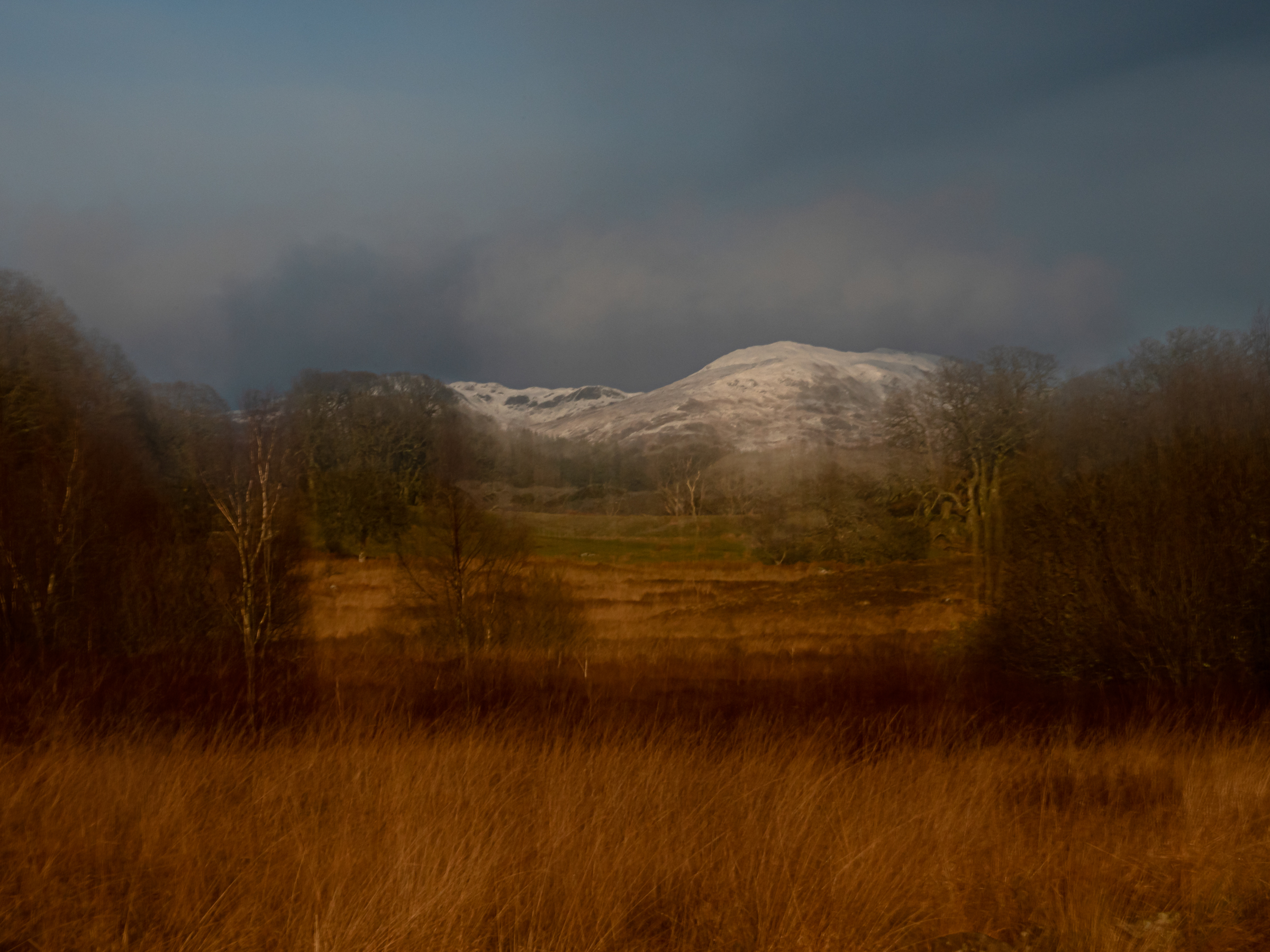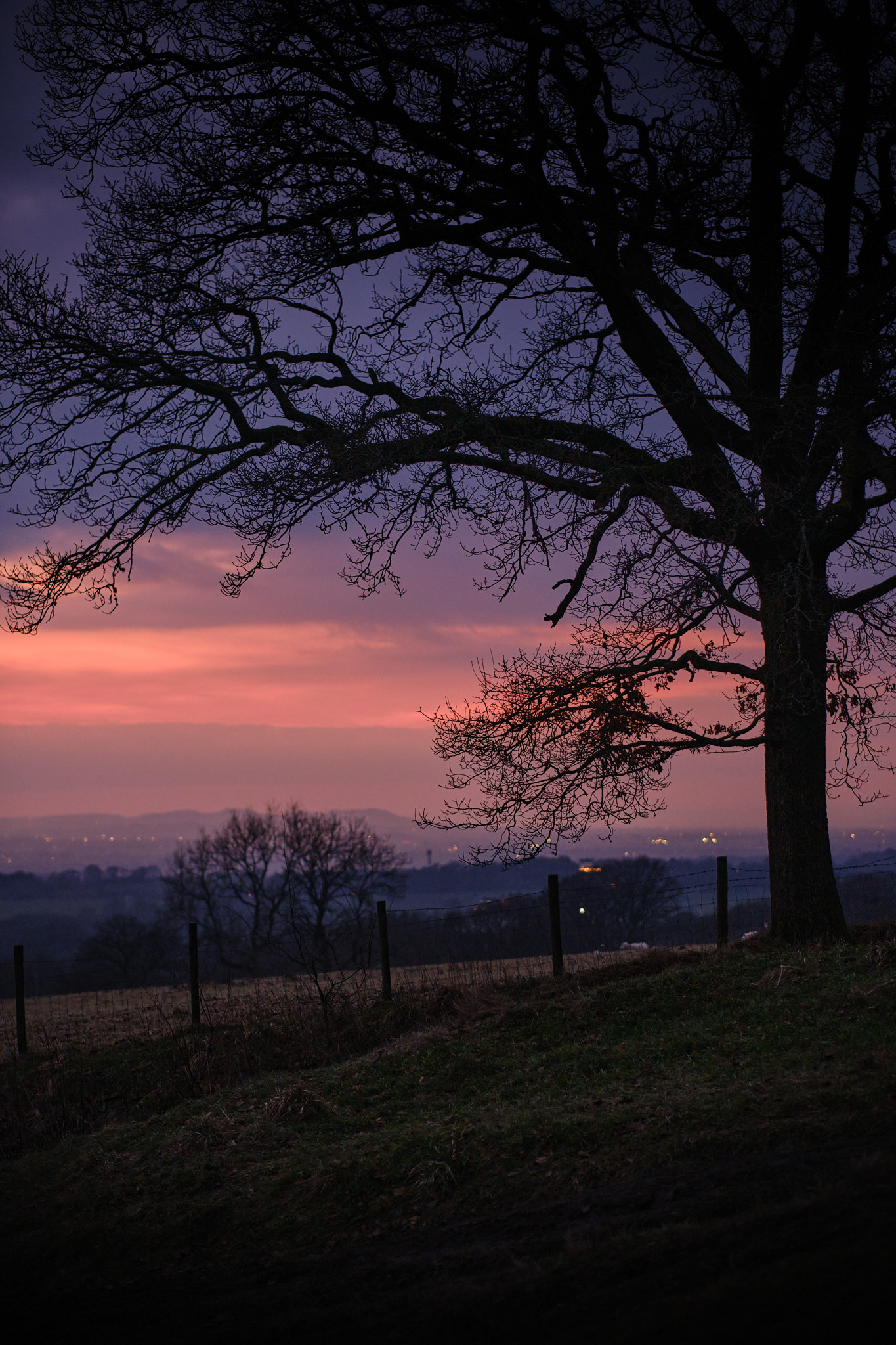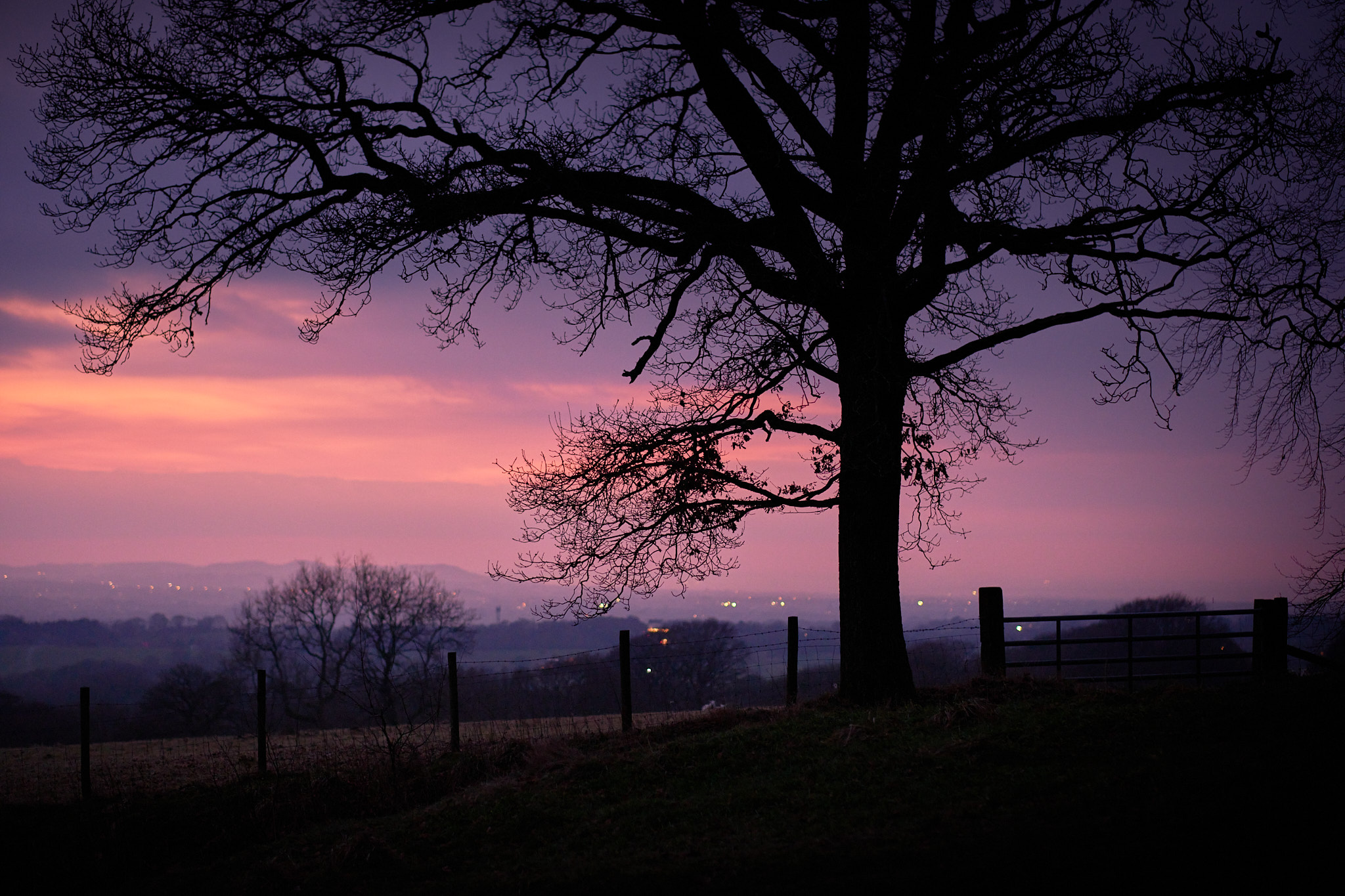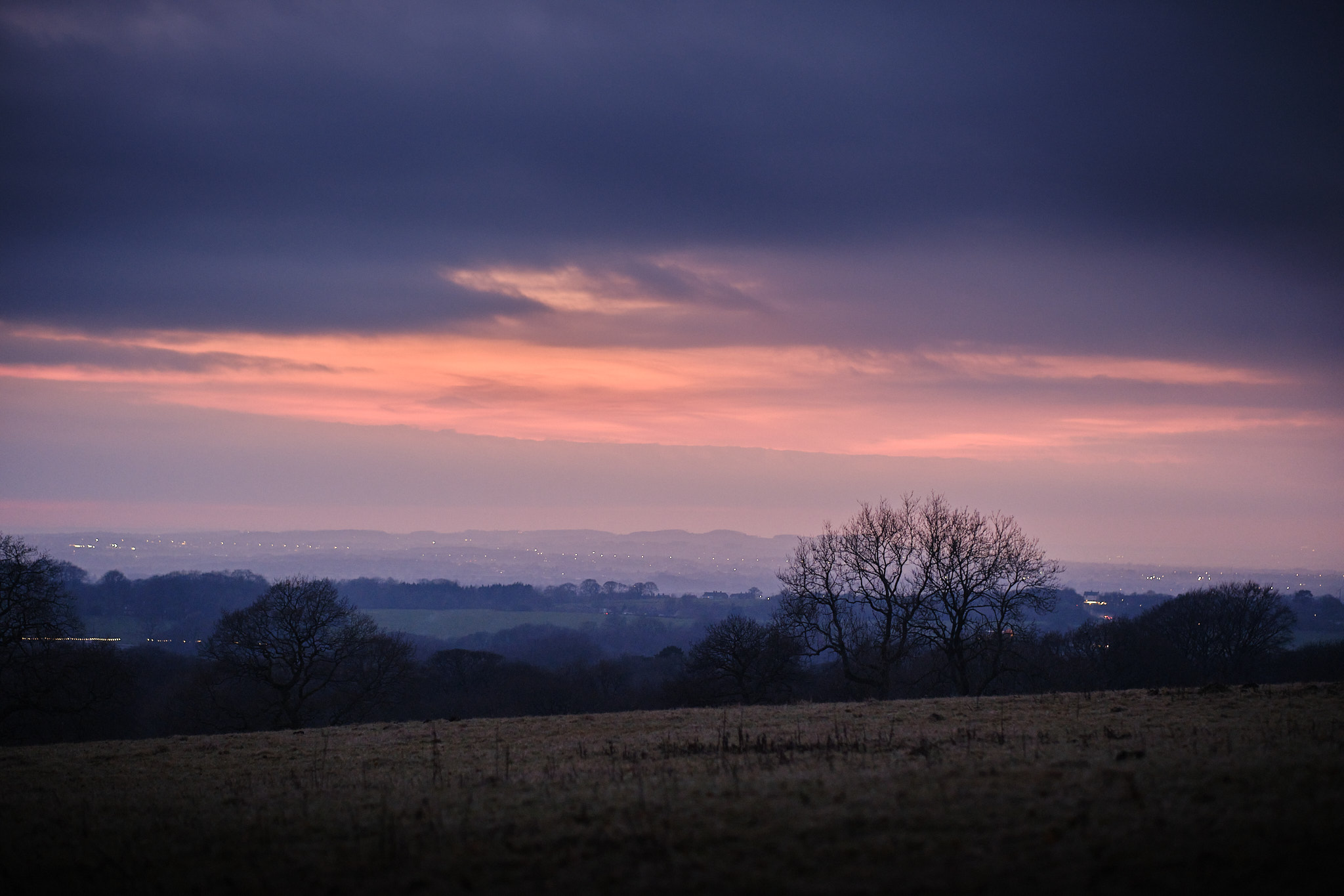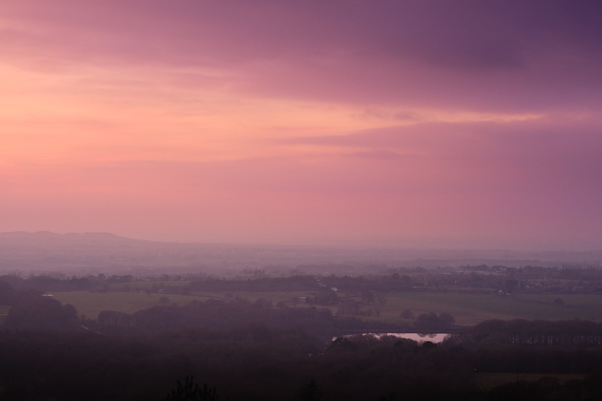 After taking the previous image, I hurried further back down the path to the boggy point where #2 was taken from. It was really dark by this point, but there was still a nice splodge of colour in the sky, gently tinting the scene below and a light mist was starting to form. Through the viewfinder I couldn't make out any of the details in the field at the bottom and the AF was really struggling to lock onto anything by this time. The foreground has been lifted quite a lot here to recover the detail and is actually quite noisy, although I don't find this unpleasant. There was quite a bit of speckled colour noise here, but I've managed to selectively eliminate most of that while leaving the luminance noise intact. Downsampling to 2K resolution hides a lot of this too, but I think this would still successfully print quite large.