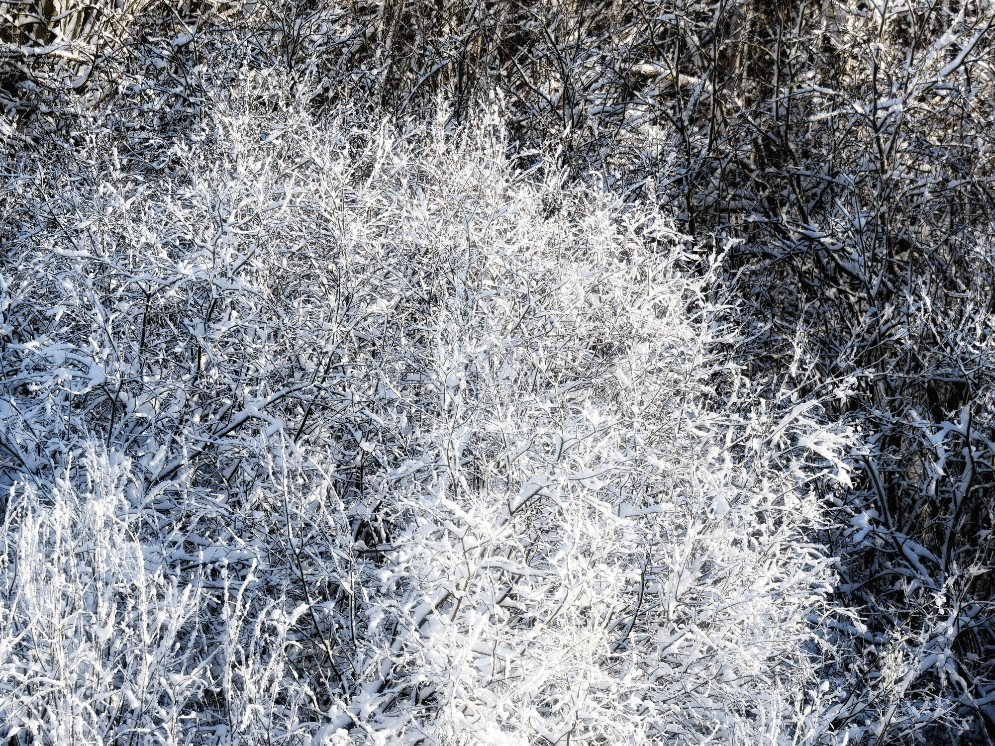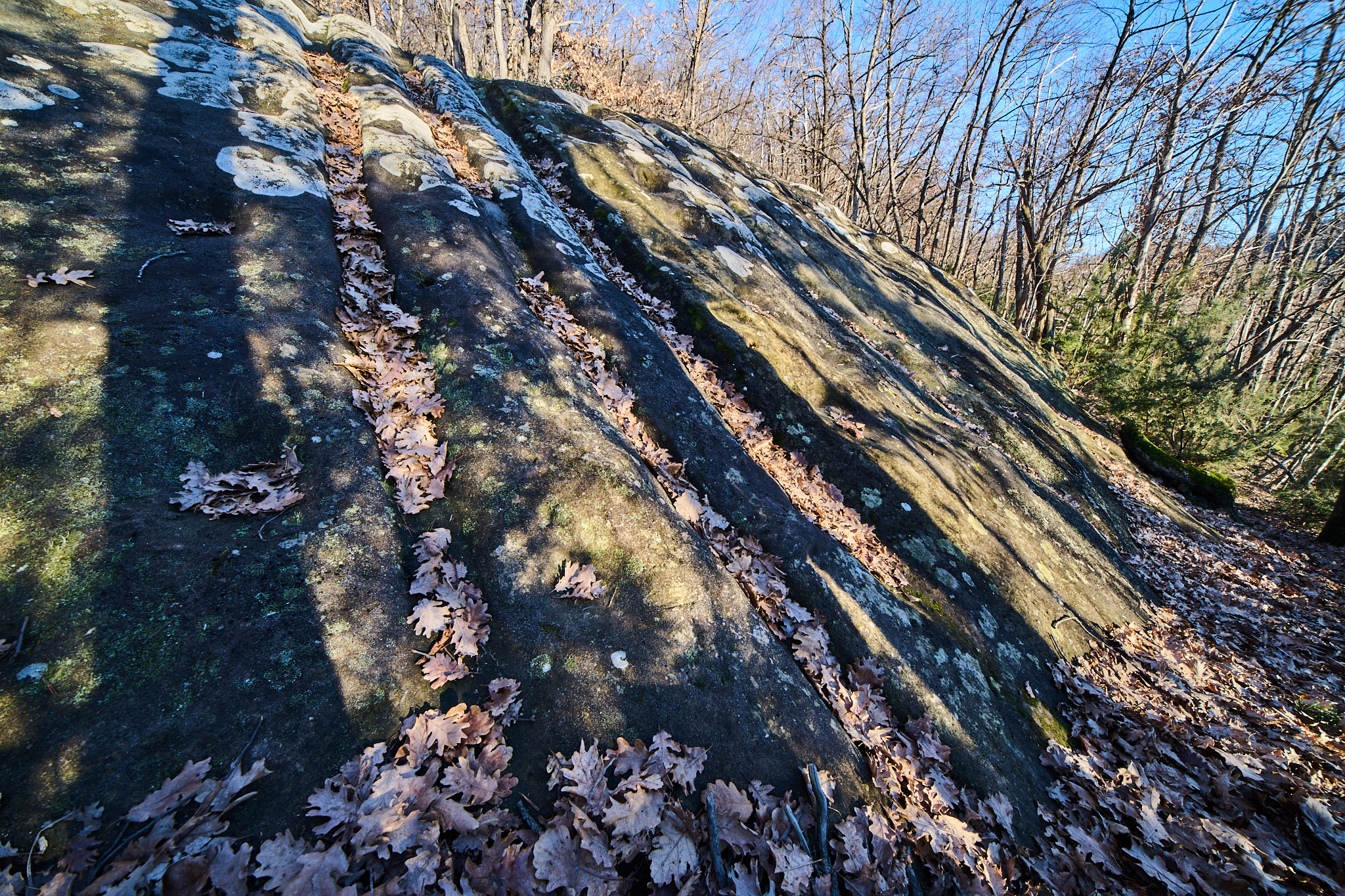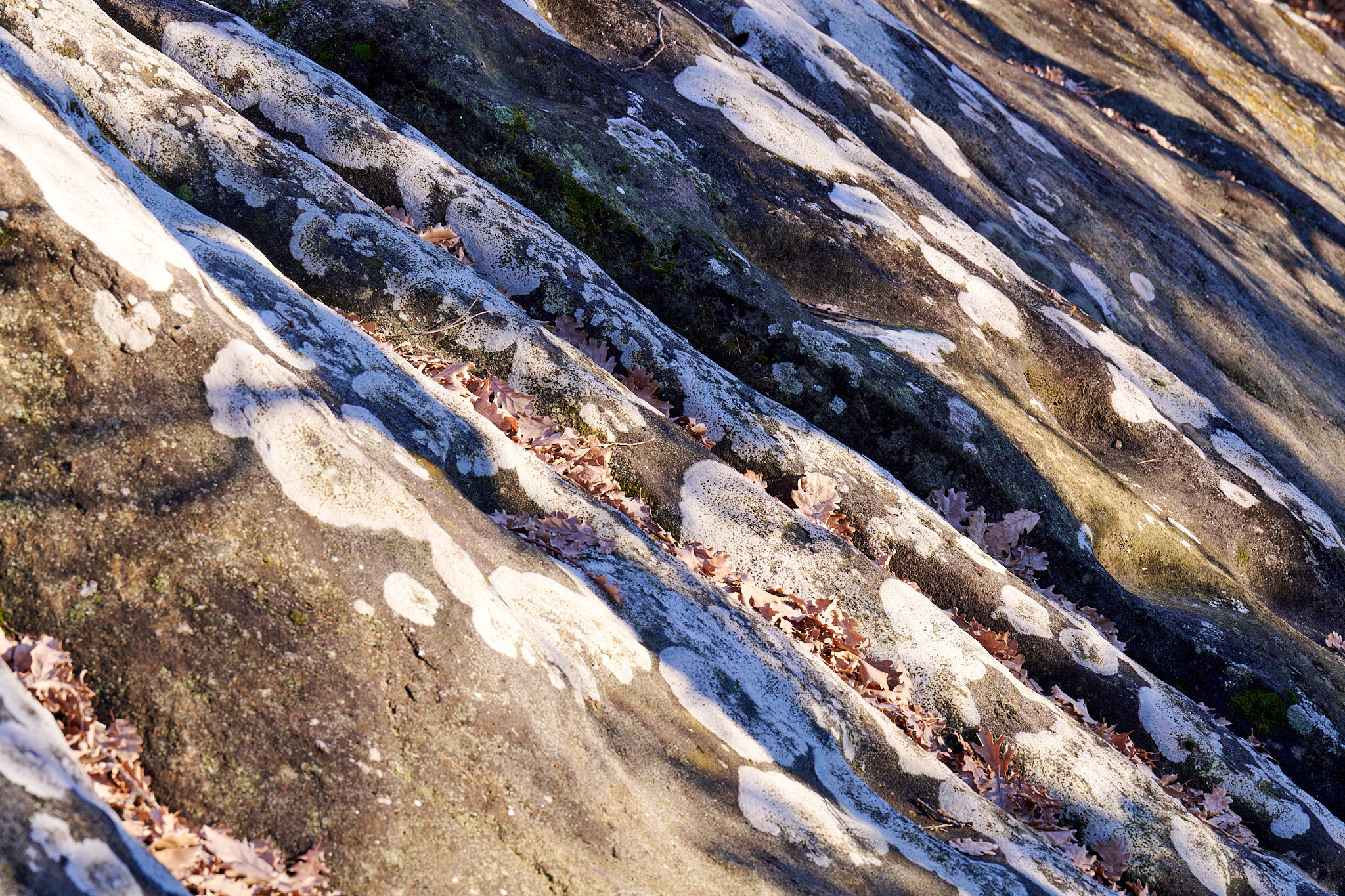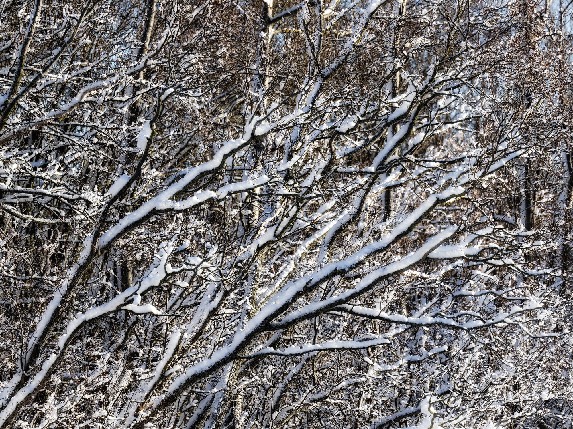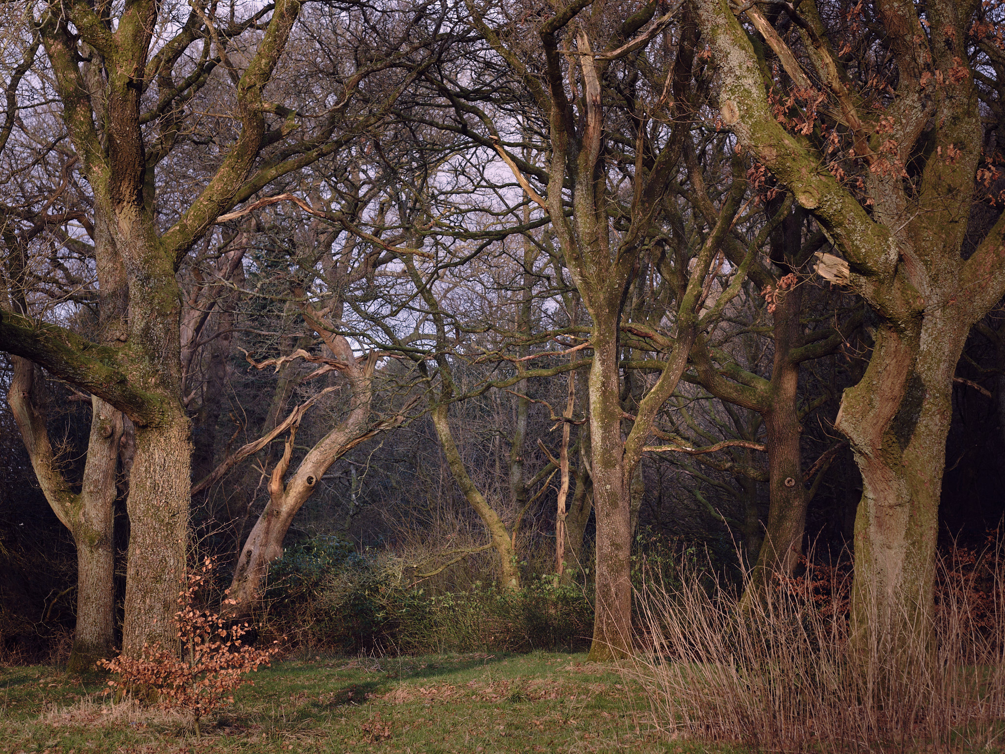 I'd barely stepped out of the car, when I was presented with this scene (or something quite like it). The sun was low and strongly lighting the foreground trees on the edge of the woods, while behind them, others were lurking in amongst the soft shadows. I think the sharp contrast made the scene so interesting in person, but photographically, those foreground trees were a real issue as they were so bright compared to the more interesting ones behind them. After a lot more manipulation than I care to mention, here's the final image.