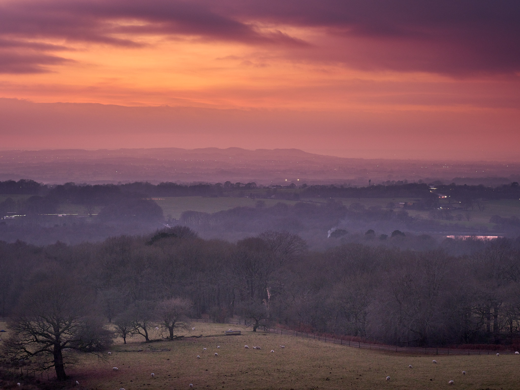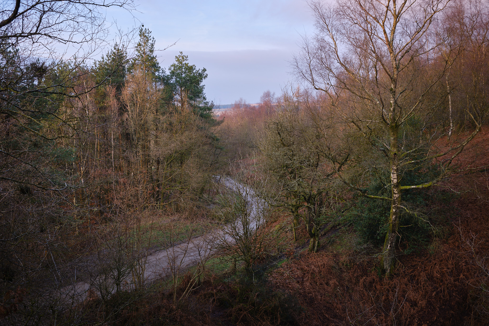 The sun had disappeared below a thick, mushy cloudbank before I began making my way back down through the woods, so I was quite surprised when the sky started to light up with nice colours. I was also scrambling for a decent vantage point to catch it from. This was taken looking over a bit of an opening in the foreground trees.
