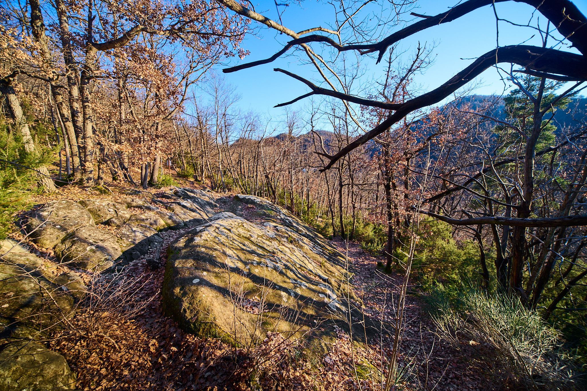 I was working my way up a steep path I'd never previously explored when I took this. There are lots of interesting trees in the surrounding woods, but getting a clear shot at them was tricky. I took this while I stopped to let my heart settle down from the effort of scrambling up the slope (gotta love those beta blockers). Again, I'm seeing elements of painted woodland scenes. It just needs a horse and cart on the track to make it look more timeless.