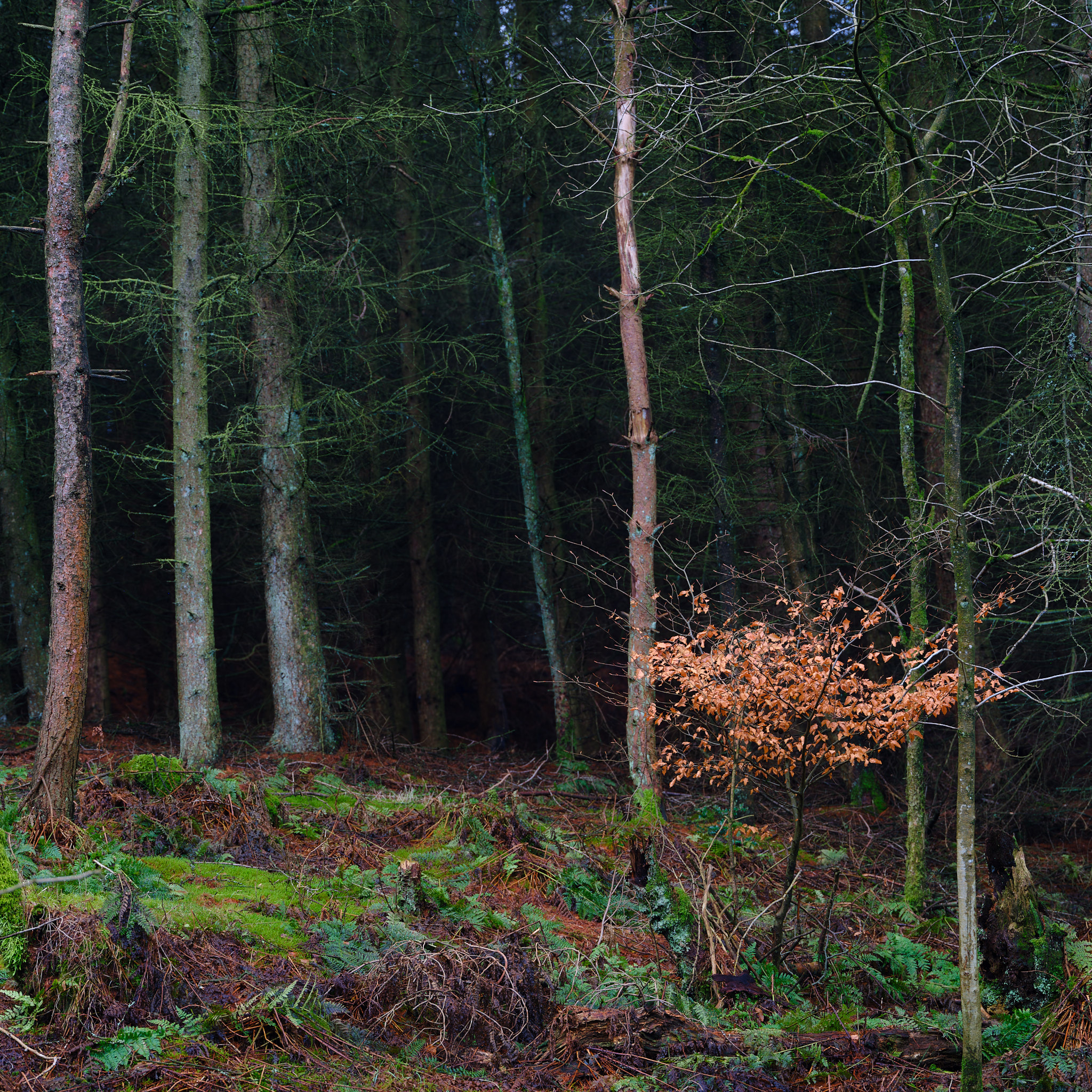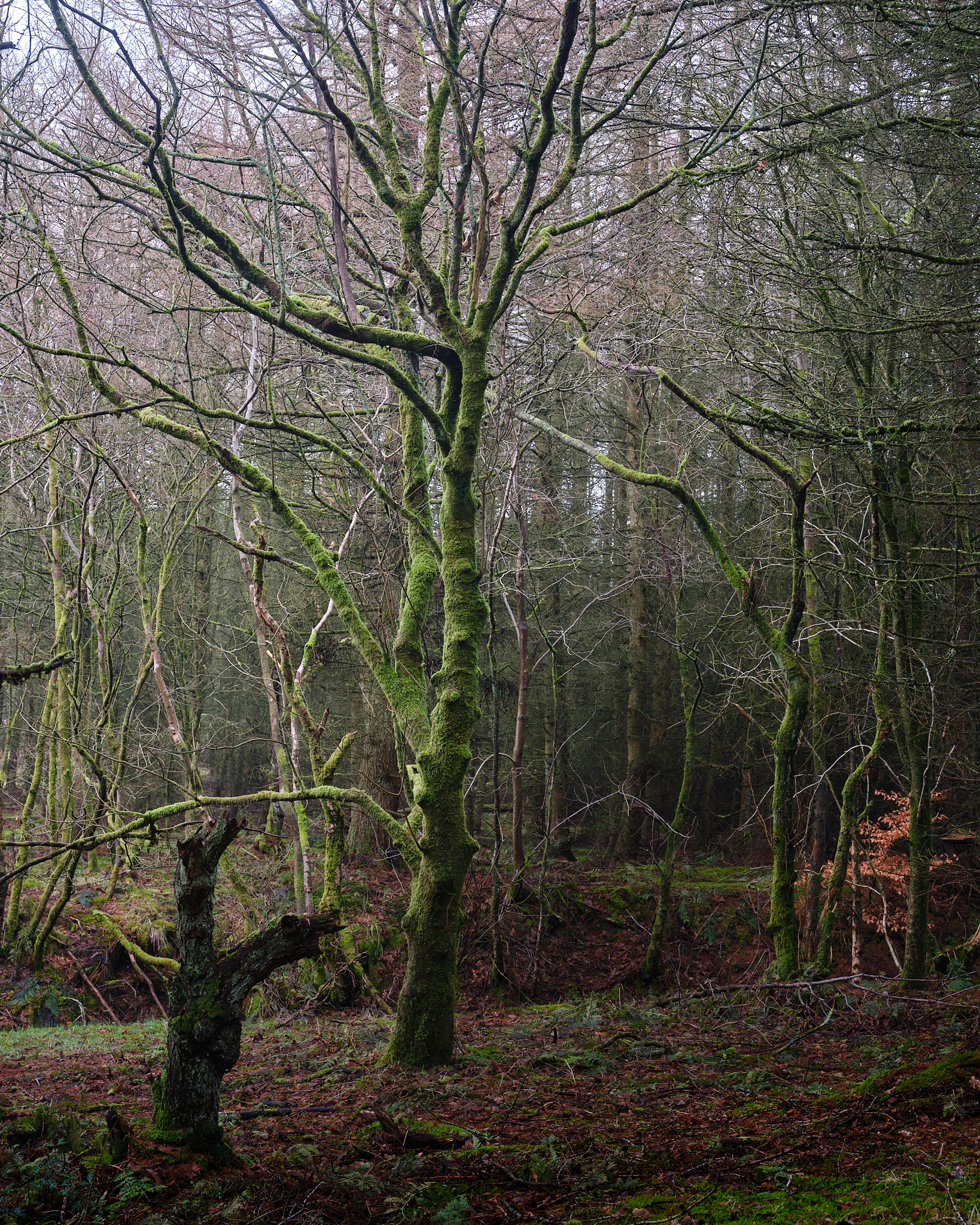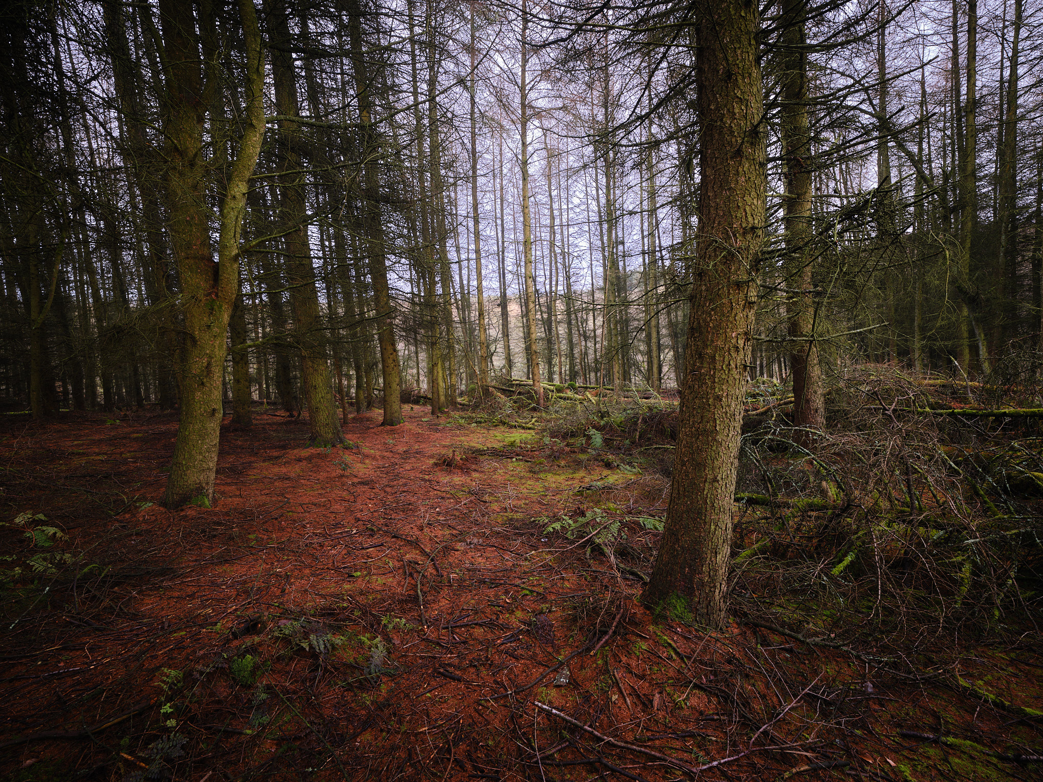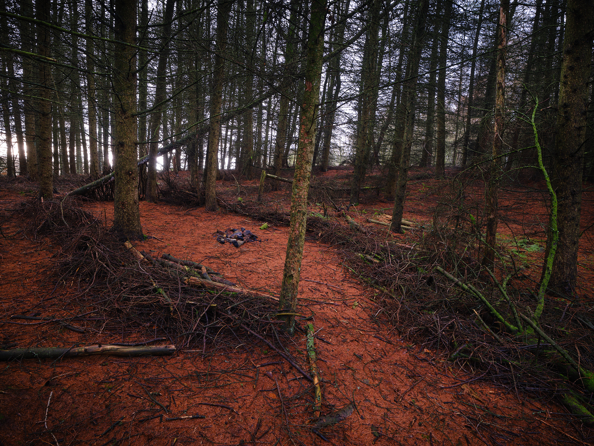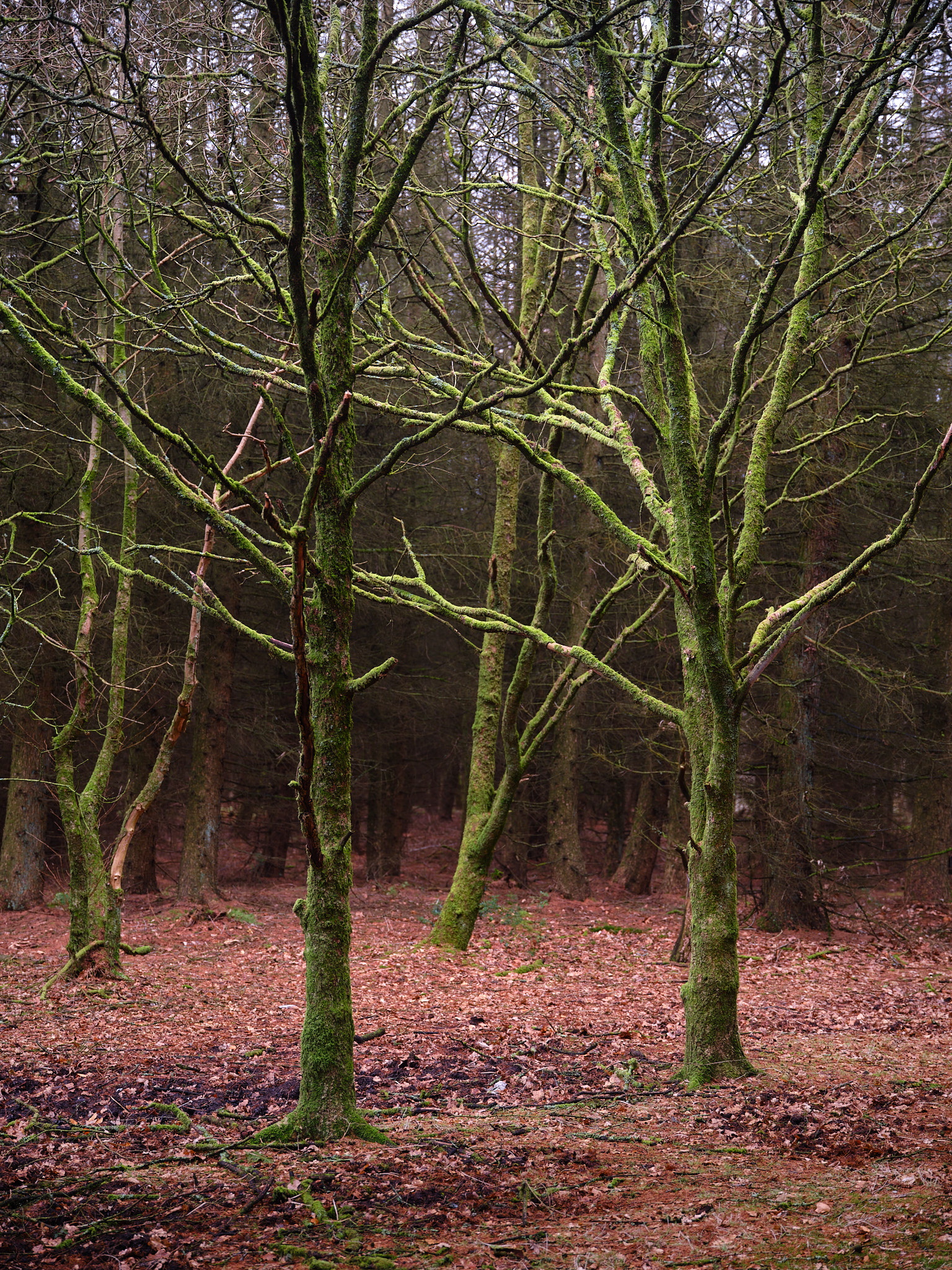 By this point, I'd crossed the stream and was making my way back down into the valley through the woods on the opposite. For the most part this is pine plantation, but I noticed a bright spot in the distance off to my left and waded through for a closer look. Eventually I found this group of reasonably unremarkable looking trees stood in a circle beneath a gap in the canopy, the latter lighting them wonderfully against the oppressive darkness of the pinewoods surrounding them.