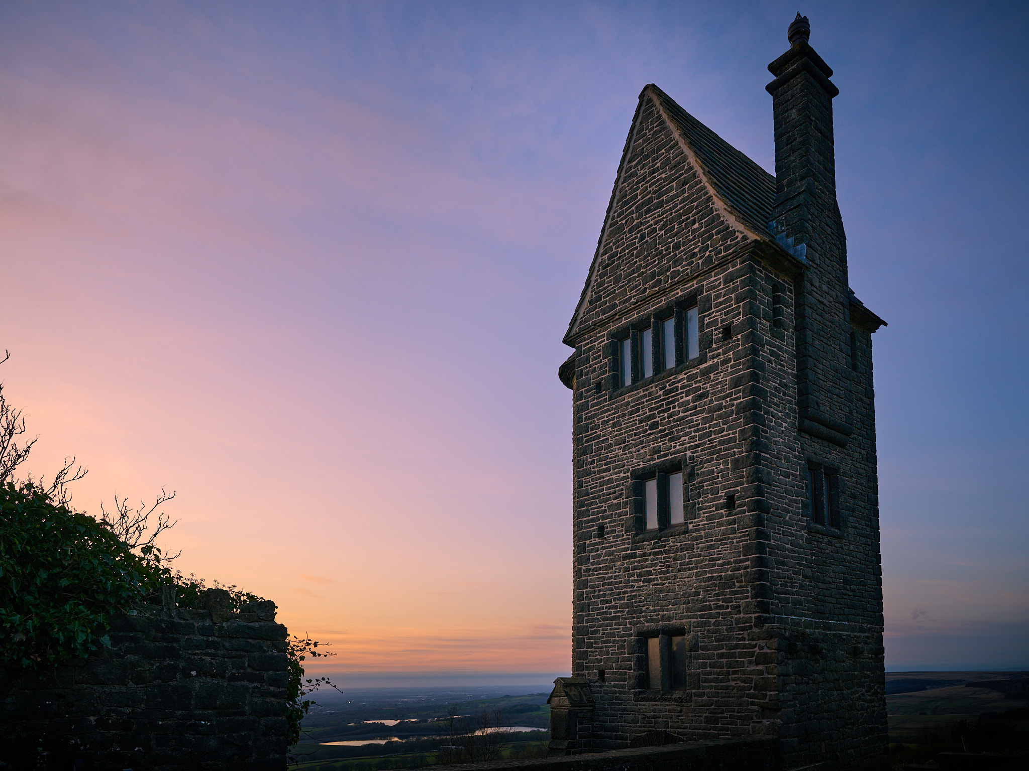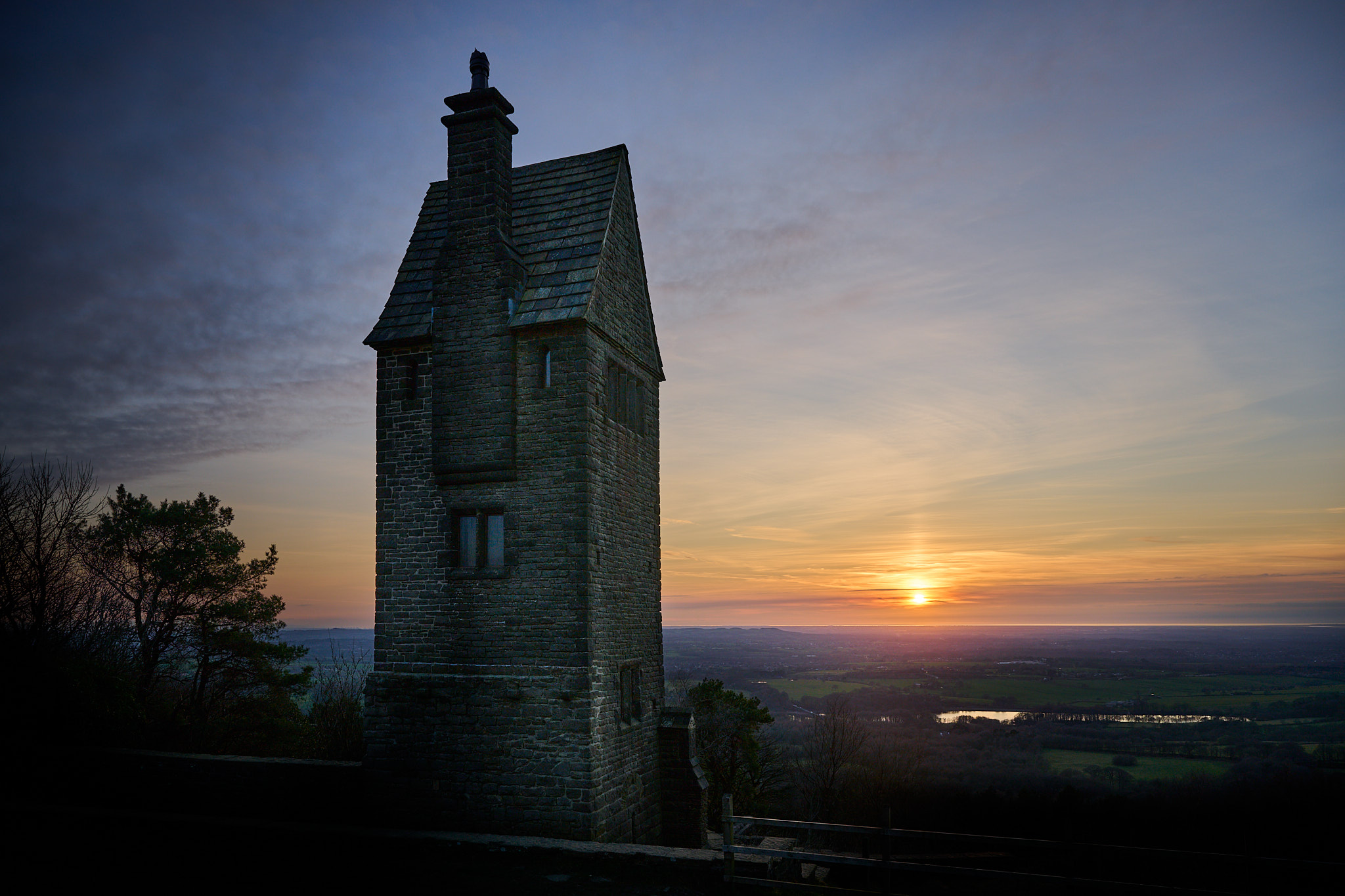 Still, for the few minutes before it hit the fog bank, there was some nice colour to enjoy and I hastily ran around at the top of the hill trying to find interesting compositions between the tower and disappearing sun. This was an obvious one, stood on the road* behind the tower and looking up at it. Fortunately, I left enough space to perspective correct it a little.