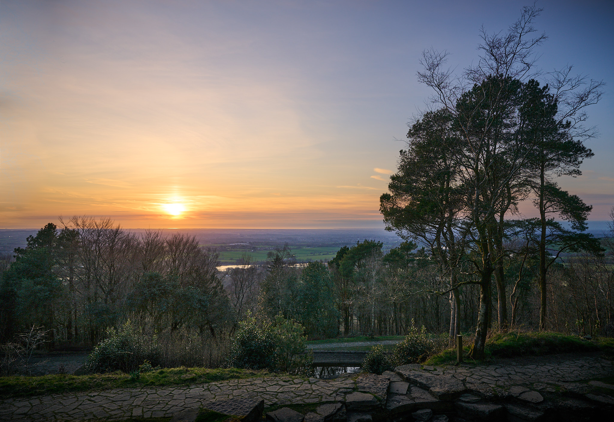 I parked at the end of the main drive that leads to the hall and barn, then set off through the woods. There are a good number of different routes running through the woods and I'm not entirely sure I've explored all of them, but as I'd only arrived on site at 17:00 and sunset was due around 18:30, I took one of the more direct ones I know in the hope I could make it to the top in time. It's only a mile or so from where I parked to the top, but it's steep and I'm struggling with a lot of leg cramp and shin splints at the moment, so I had to take my time.