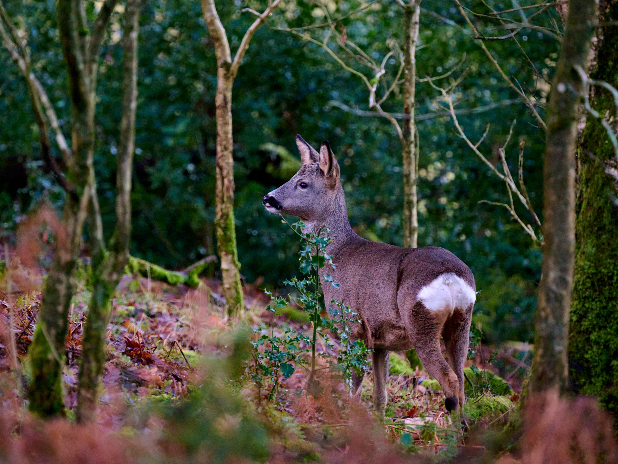 My route back to the car took me through some woods. It was getting dark, so I wasn't really expecting to get any more interesting images, but as I wandered through the woods, I spotted a doe up on the hillside a little way to my left. She was stood watching me, apparently waiting to see what I did next. Slowly I raised the camera and started firing off shots. Usually this is their cue to bolt off into the woods, but she just stood her ground. We held this position for about five minutes.