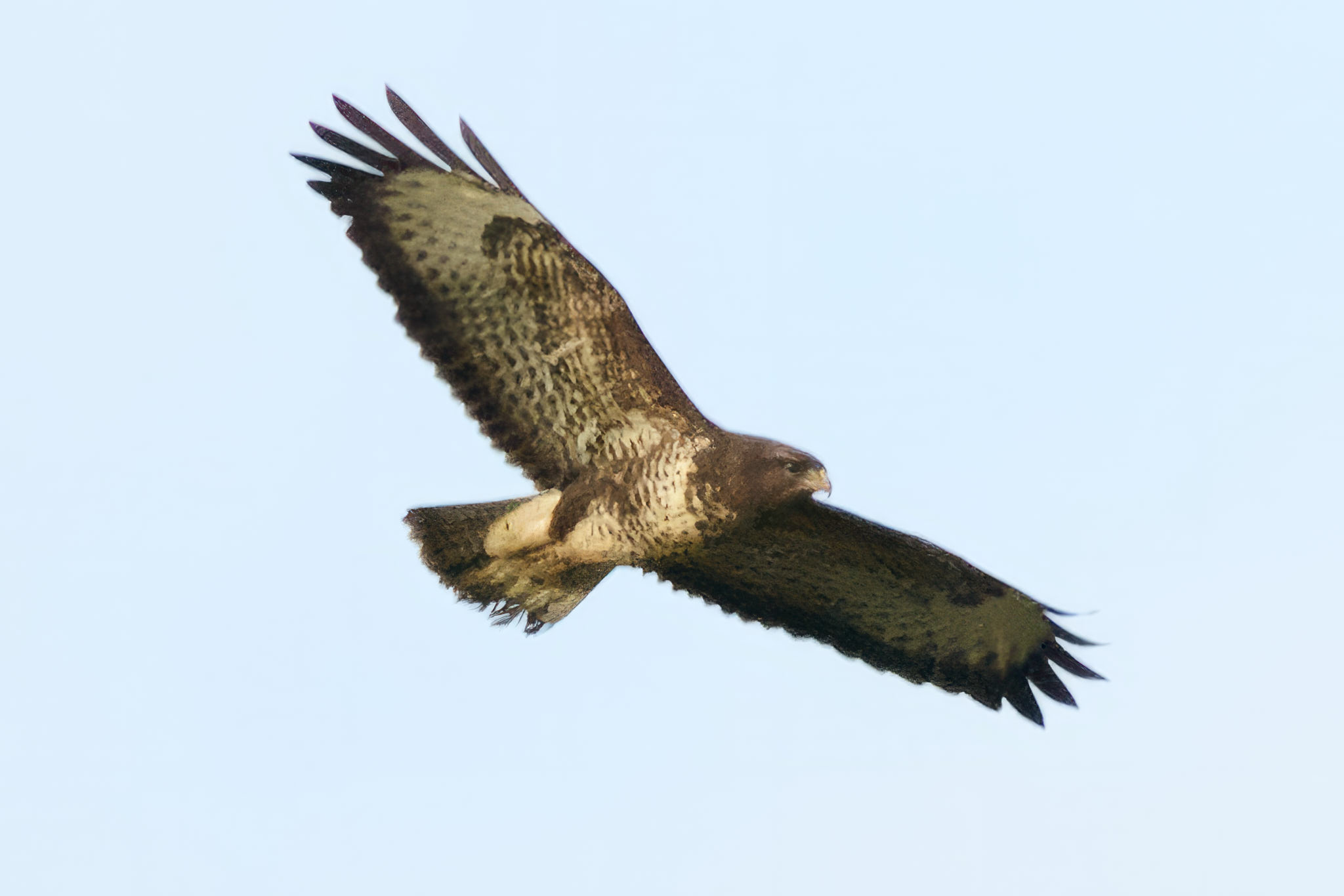 Since taking an interest in Kestrels, I'm tending to notice more birds of prey while they're flying in the sky. They've got a particularly lazy looking style to them as they cruise effortlessly at high altitudes, circling over fields, looking for prey. I spotted this common Buzzard looping over the field I was stood in, but it never really got close enough for a good picture with the 100-400 (on the Z8 in this case), so this image has been cropped and upscaled quite a bit. Still, it's another interesting bird to keep an eye out for.