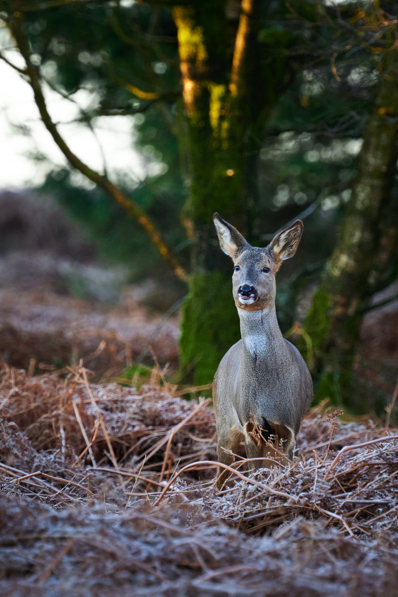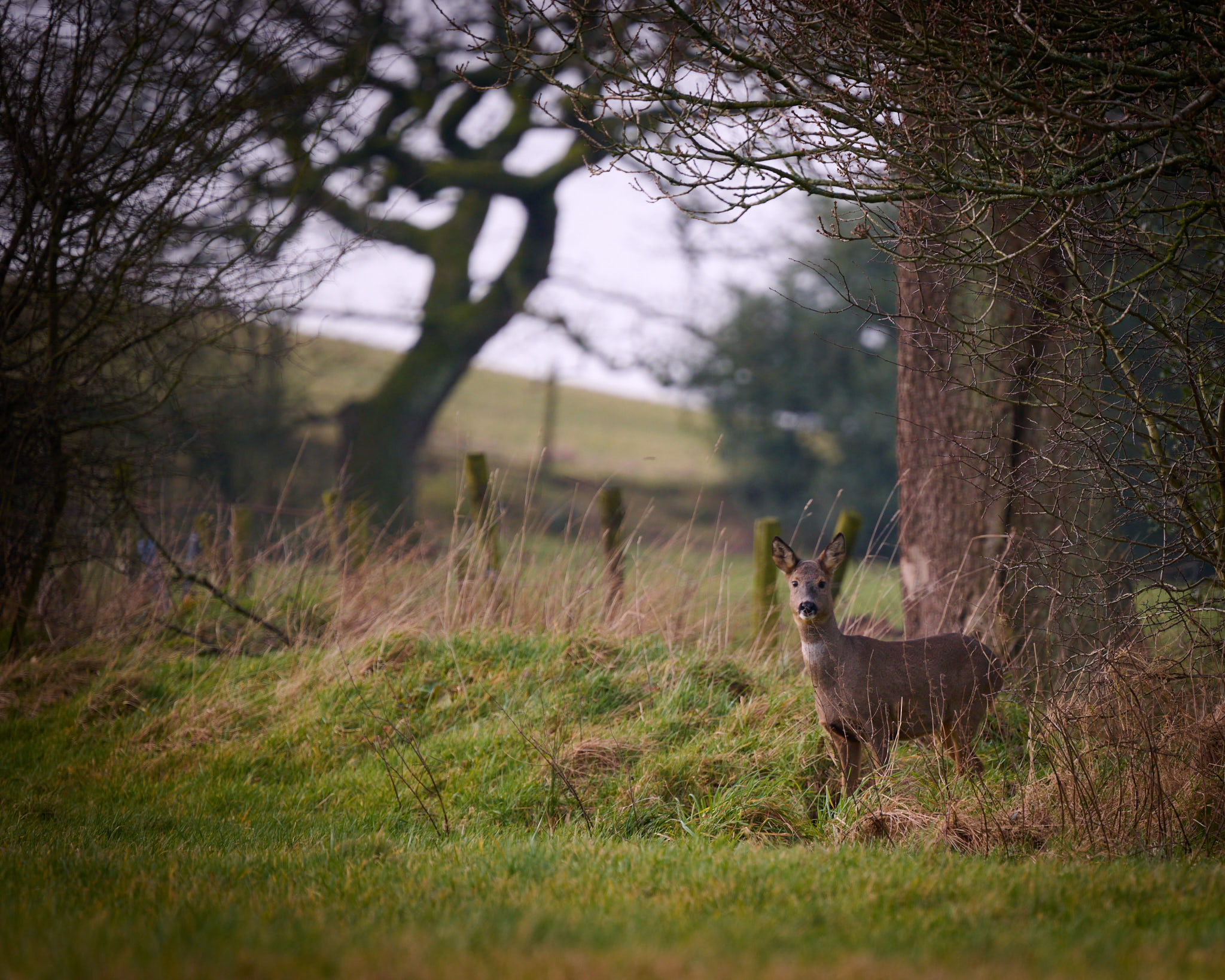 From the same morning as the dancing trees, I spotted this doe and her buck (who is skulking around in the ditch behind her) while packing my things back into the car, so I quickly got the camera out again and took a few shots before they scuttled off. I like the way the trees framed her in this instance and the soft, early morning light that started breaking through the clouds around 9ish really gives this a nice feel.