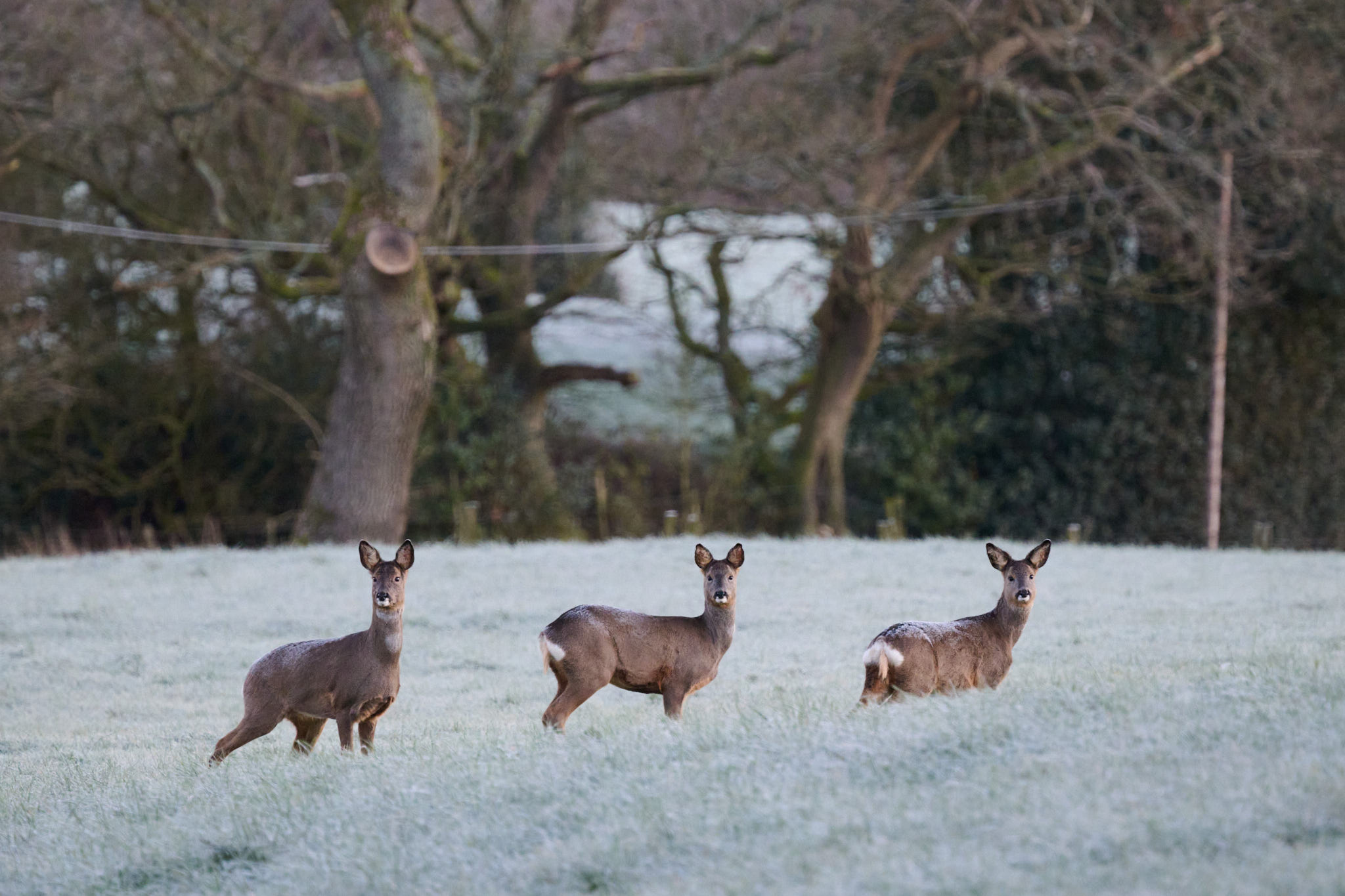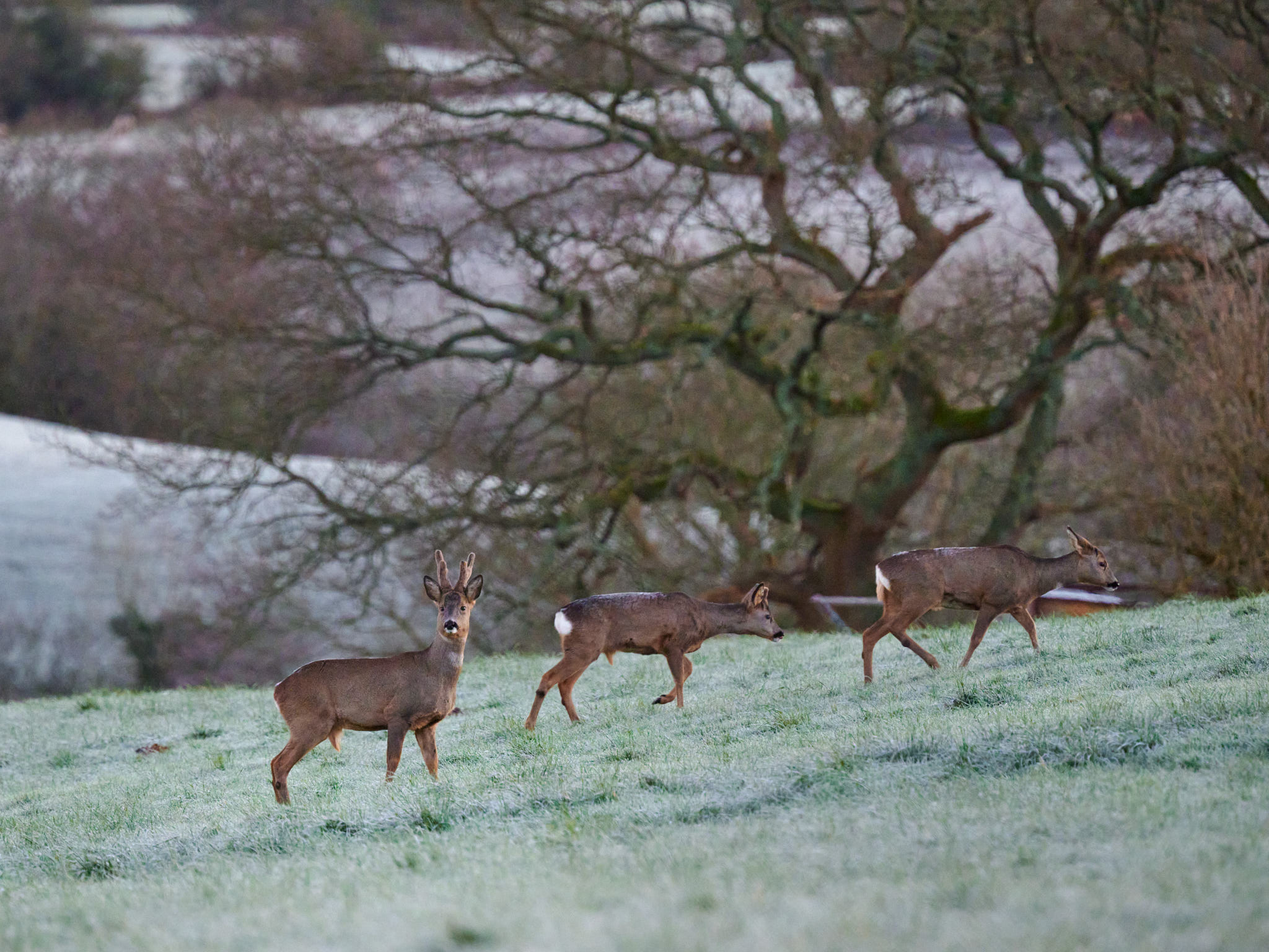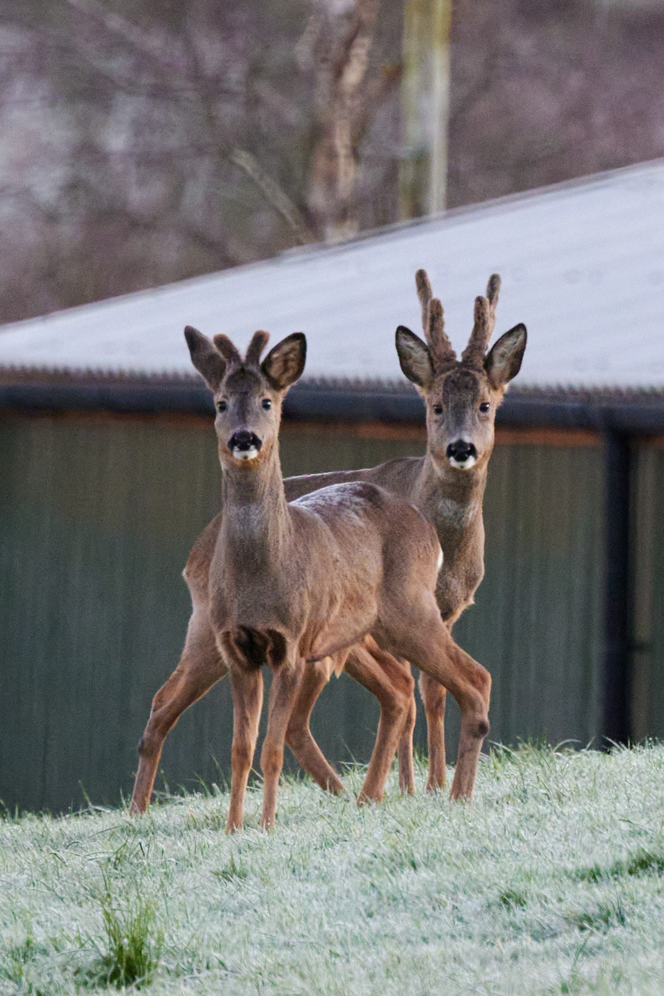 A wider shot showing the frosty conditions. Even the deer themselves have frost on their backs, that fur must be brilliant insulation.