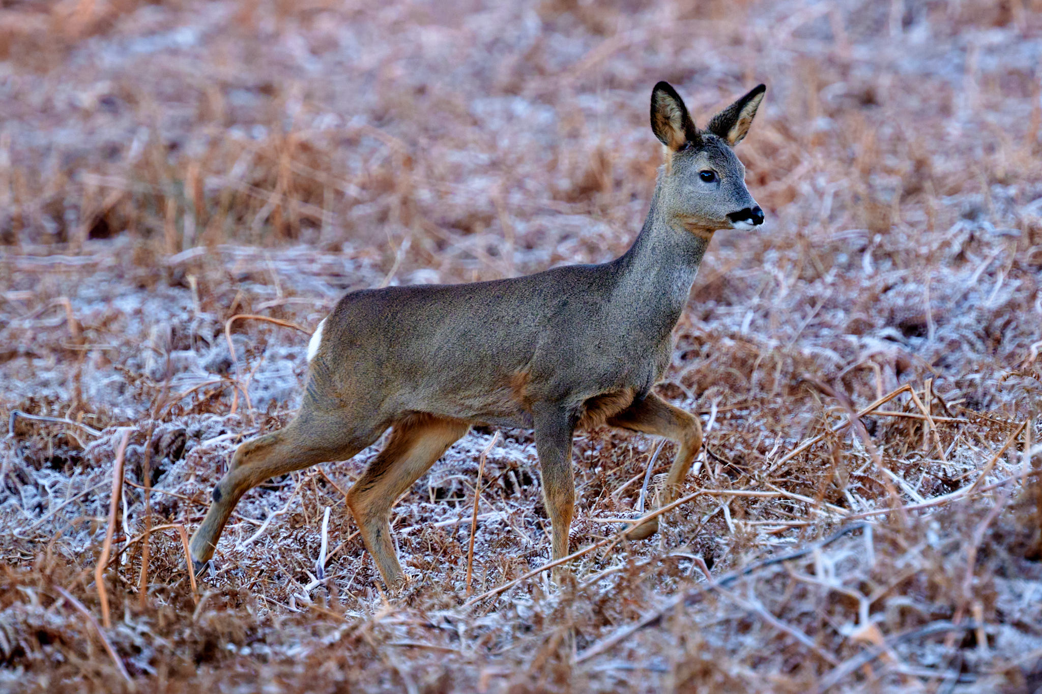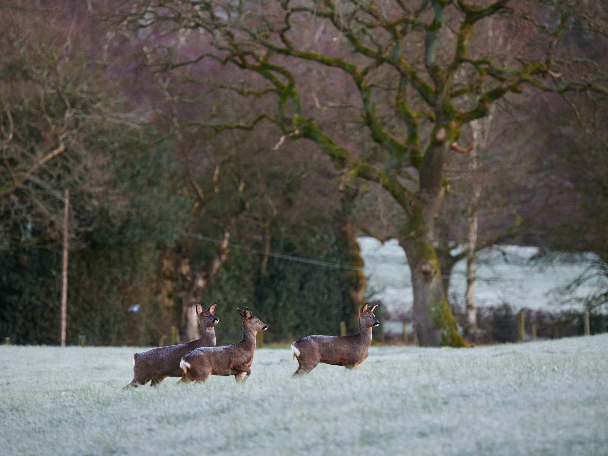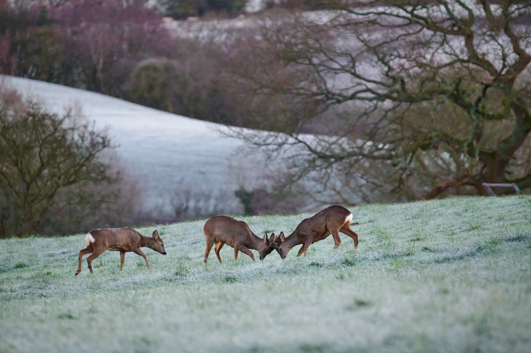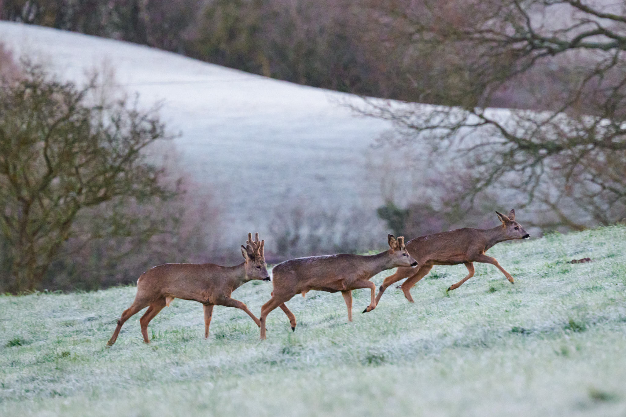 A wider shot showing the frosty conditions. Even the deer themselves have frost on their backs, that fur must be brilliant insulation.