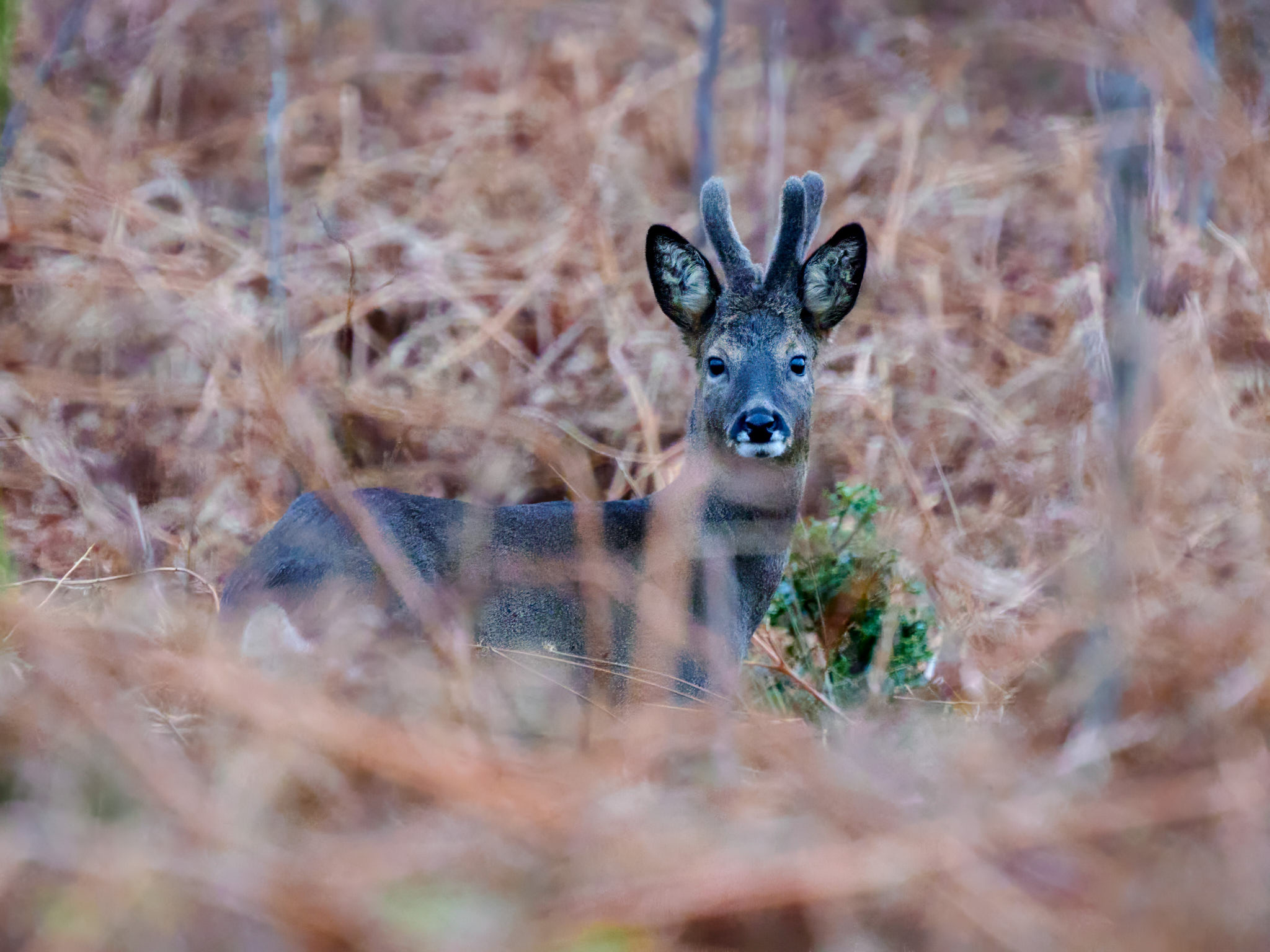 At this point the two bucks decided to start a fight. Now, I've photographed the deer rut in the Lake District a couple of times and being bellowed at by large red deer with fearsome antlers is somewhat intimidating. These guys on the other hand were vaguely comical as, armed with small, velvet covered antlers they risked giving each other a nasty nudge. The lone doe slowly sneaks past, probably tutting and shaking her head as she goes.