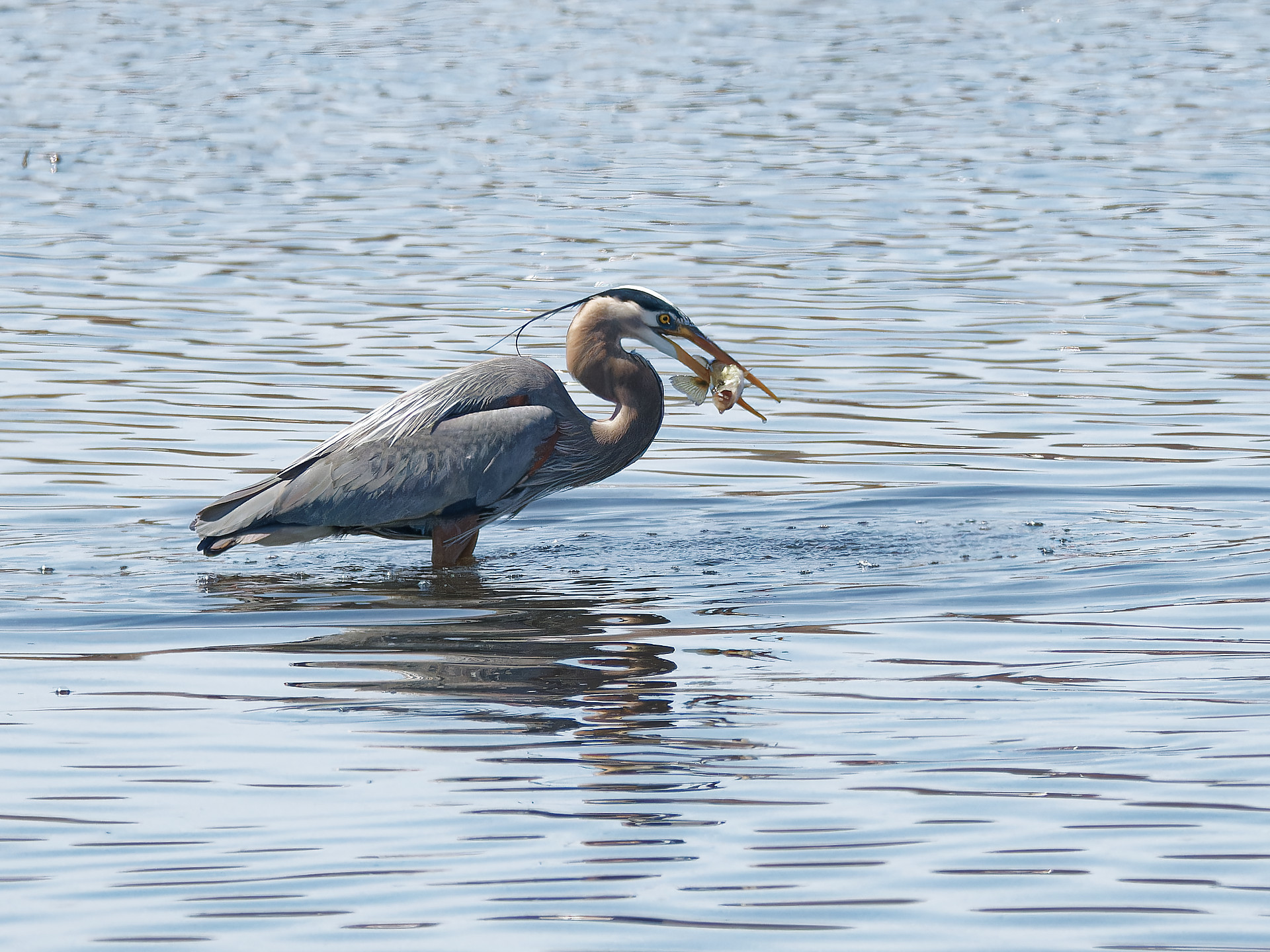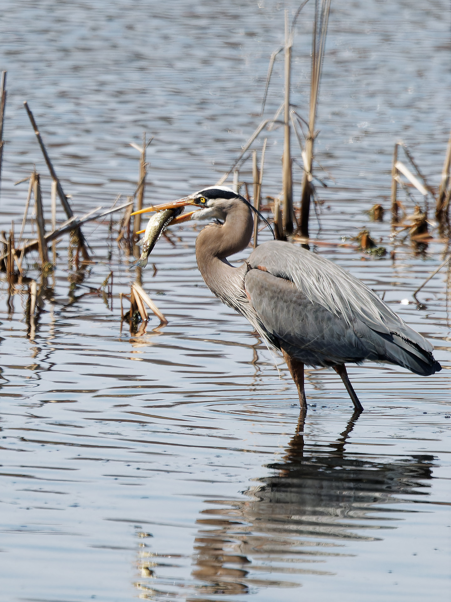 Next I spotted a Blue Heron stalking a fish. Got it plunging after the fish, then coming up with a big juicy one.