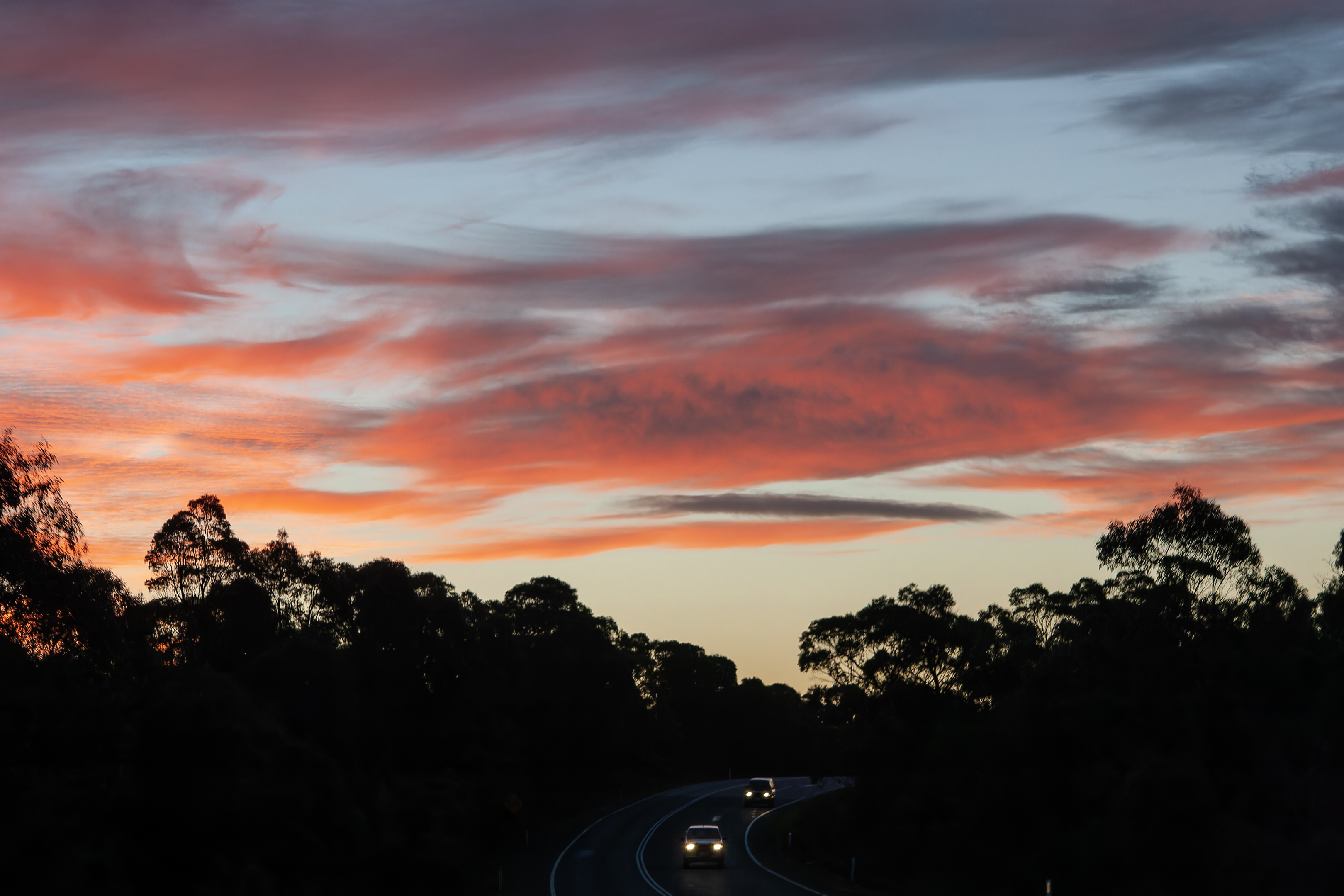 I like these sunset pictures …. I often want to see a bit of foreground or hints of detail in the tree .. Here I think I like the cars on the road and yet it confuses the story, IMHO. The cars attract me and tell the story of going home after a long day but the dominance of the sunset bounces me up into the sky and makes me think the story is that sunset and then the cars distract! .. I'll have to think about that .. Overall I though this well executed and a good picture .. and maybe the bounce is part of the story, ….