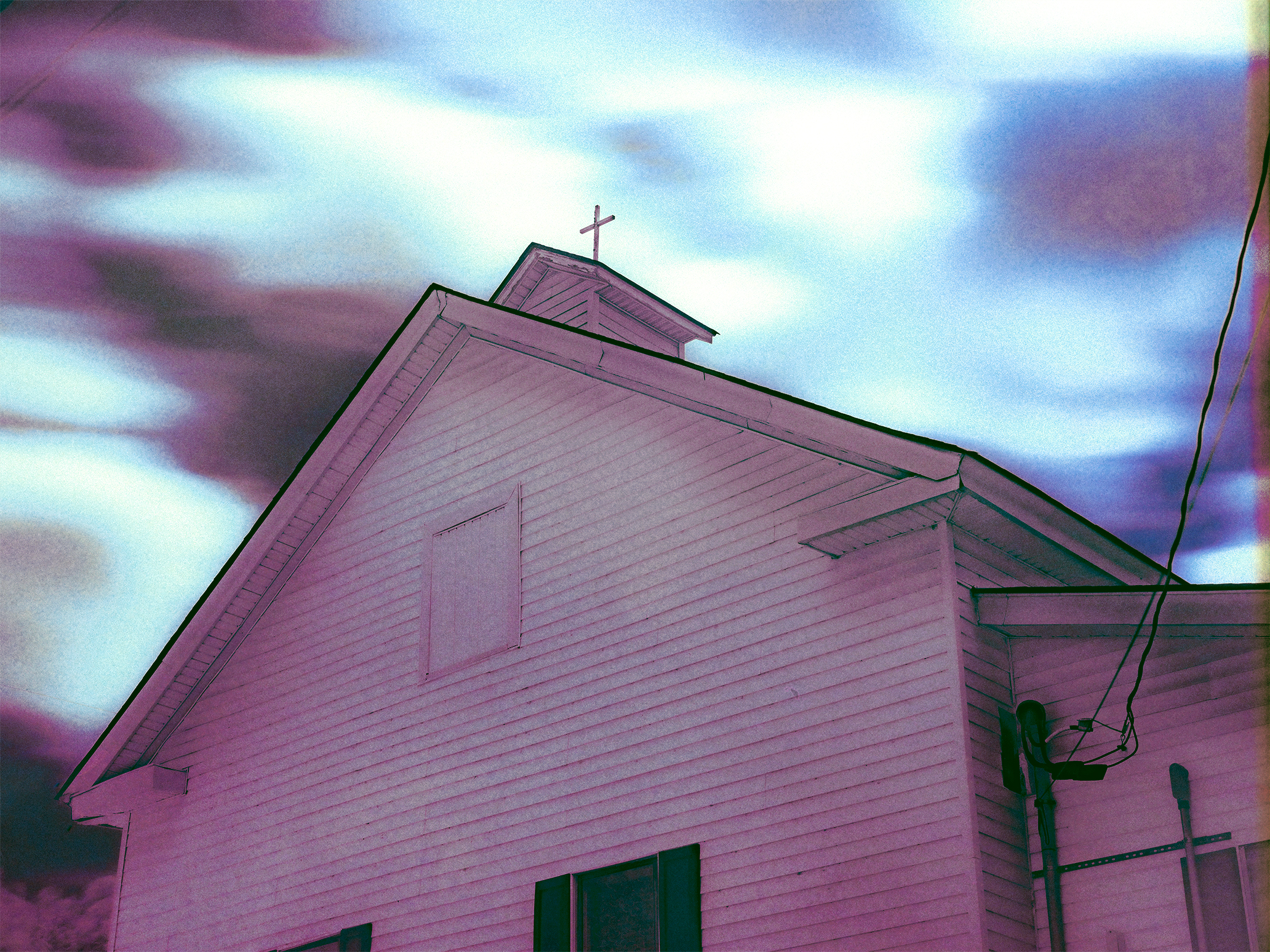 I wouldn't say that I hate it but I don't like it. It reminds me of the sort of shot You are likely to meet in a melodramatic film of ghosts and exorcists and the like in a little isolated country town. The purple colouring, the dramatic cross against the sky, the low upwards peering angle with dramatic over contrast toned and out of focus clouds. It looks like the kind of effects utilized to build atmosphere on the cheap. If early in the film I'd be guessing that low budget applies to the plot as well and I'd be considering the exit.