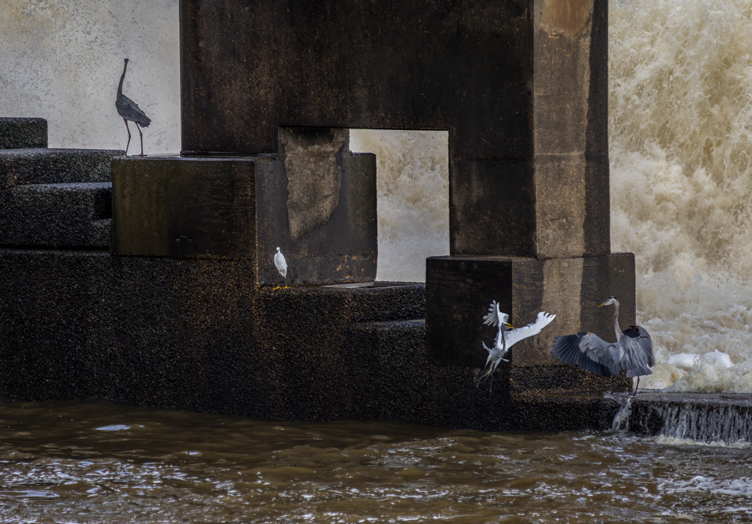 I just can't resist when these guys conduct Perch Wars. I am compelled to go spend time there. This image is flawed, I just don't know if it's fatal, I did what I could do to rescue it. I had bet on the egret winning the match and the blue taking flight. The great egrets have been winning the perch wars for the past few years, we'll see if the blues can make a comeback. And I am stuck about 20 feet further back than I was for the last Perch Wars, since my medical woes make that kind of risk-taking unwise.