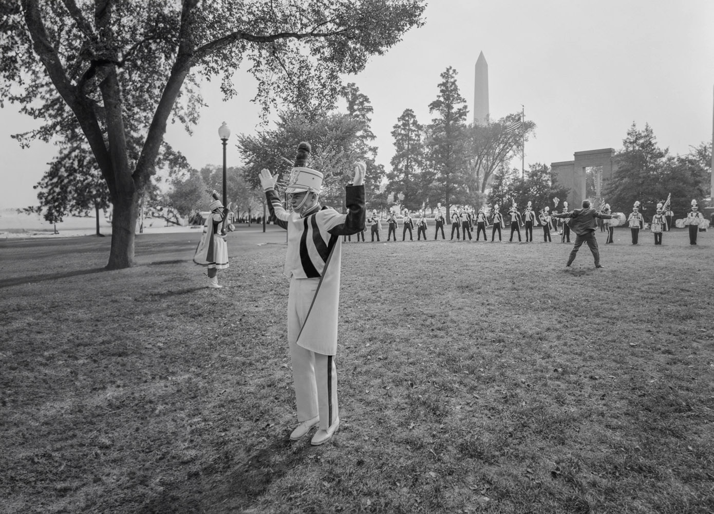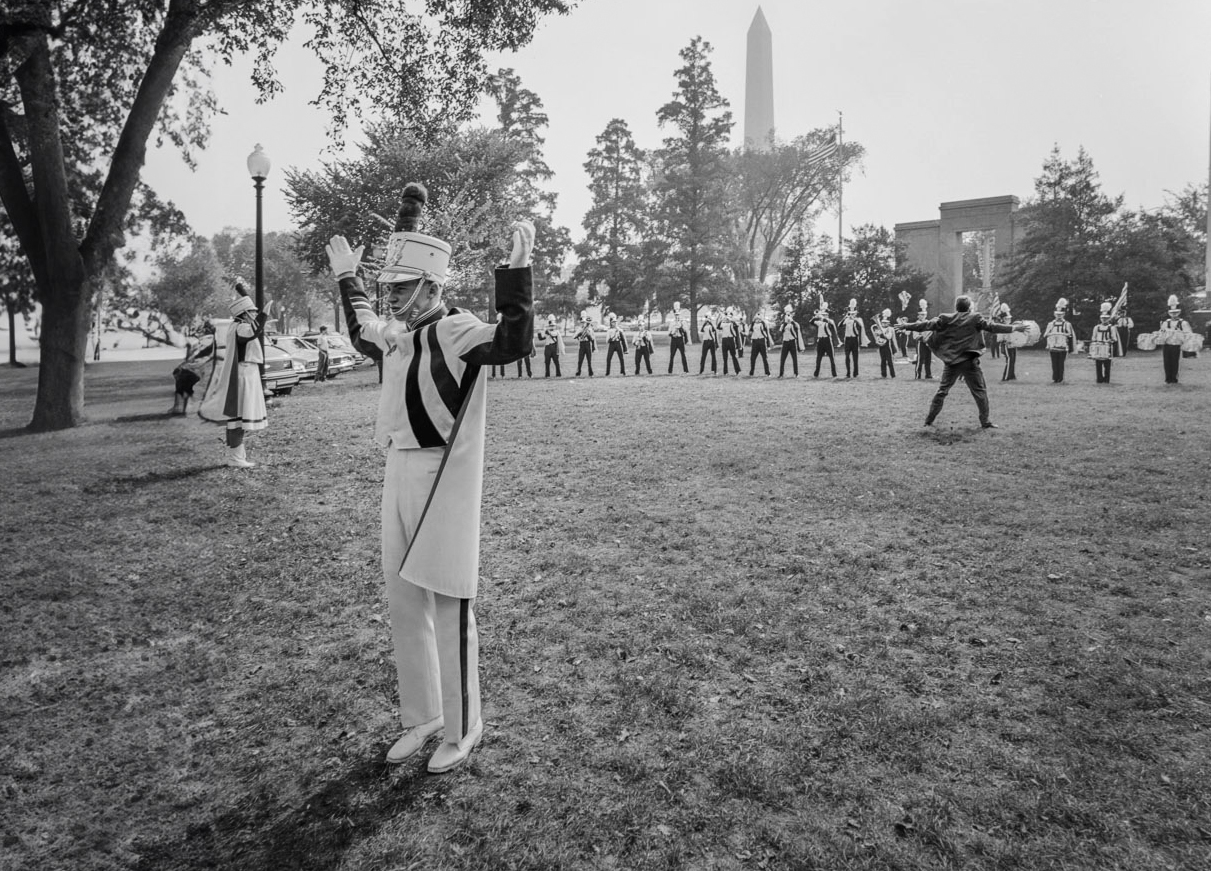 The problem I have with this shot is the positioning of the two figures on the left side close to the frame edge, especially the largest closest to the camera. We can see just enough of the band uniforms to be confident that the two figures are part of the performance. The remoteness of the two, especially the man with his back turned to the conductor and musicians, is what gives the shot its bite. The trouble is, as shown, I can't believe it. Being so close to the left edge, we can't see what is in front of them. My head makes the assumption and fills in the dots that something/someone is before them. and cut off by the left edge. While this may not be so, it feels to me that this is what's happening rather than that they are performing and involved with those behind them at that distance.