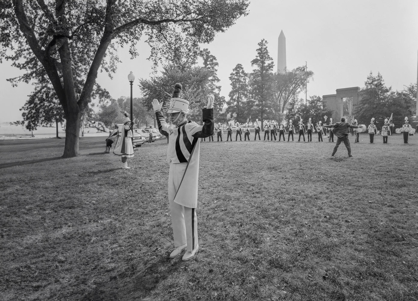 The guy in the band uniform closest to the cars is telling the crowd to calm down.